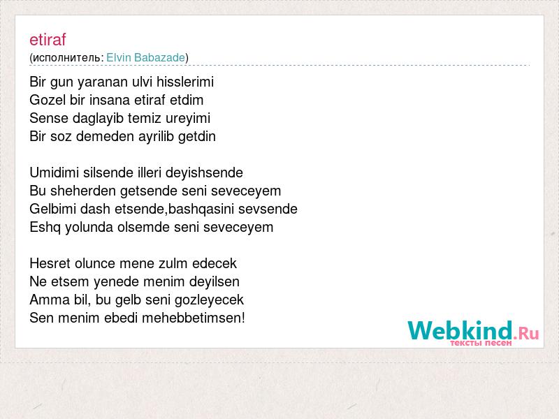 Bir gun yaranan ulvi hisslerimi Gozel bir insana etiraf etdim Sense daglayib temiz ureyimi Bir soz demeden ayrilib getdin Umidimi silsende illeri deyishsende Bu sheherden getsende seni seveceyem Gelbimi dash etsende,bashqasini sevsende Eshq yolunda olsemde seni seveceyem Hesret olunce mene zulm edecek Ne etsem yenede menim deyilsen Amma bil, bu gelb seni gozleyecek Sen menim ebedi mehebbetimsen!