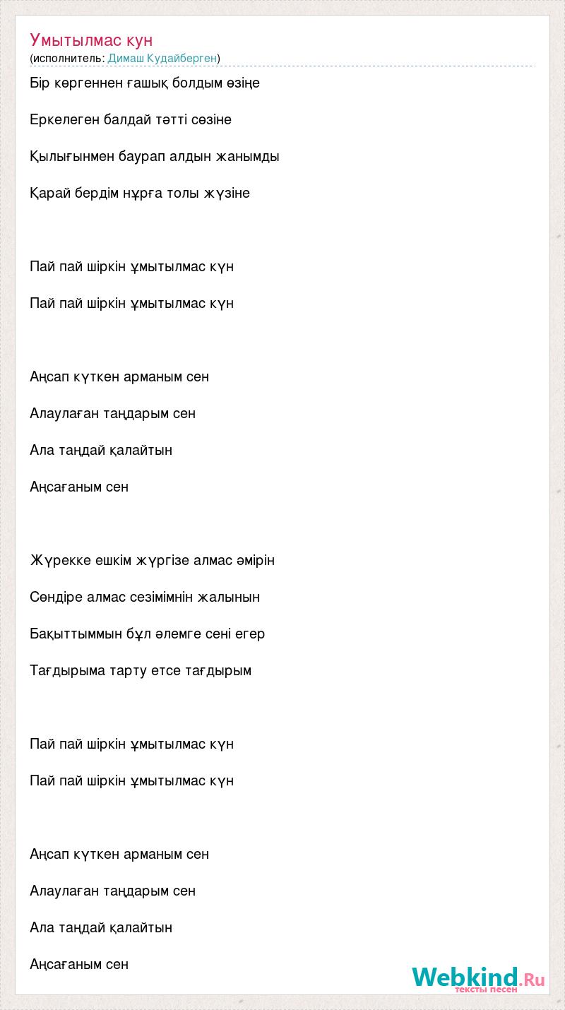Бір көргеннен ғашық болдым өзіңе Еркелеген балдай тәтті сөзіне Қылығынмен баурап алдын жанымды Қарай бердім нұрға толы жүзіне Пай пай шіркін ұмытылмас күн Пай пай шіркін ұмытылмас күн Аңсап күткен арманым сен Алаулаған таңдарым сен Ала таңдай қалайтын Аңсағаным сен Жүрекке ешкім жүргізе алмас әмірін Сөндіре алмас сезімімнін жалынын Бақыттыммын бұл әлемге сені егер Тағдырыма тарту етсе тағдырым Пай пай шіркін ұмытылмас күн Пай пай шіркін ұмытылмас күн Аңсап күткен арманым сен Алаулаған таңдарым сен Ала таңдай қалайтын Аңсағаным сен