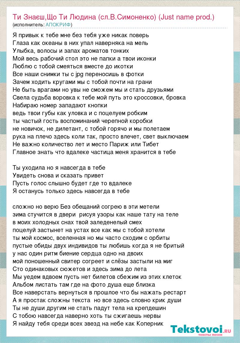 Я привык к тебе мне без тебя уже никак поверь Глаза как океаны в них упал наверняка на мель Улыбка, волосы и запах ароматов тонких Мой весь рабочий стол это не папки а твои иконки Люблю с тобой смеяться вместе до икотки Все наши снимки ты с jpg переносишь в фотки Зачем ходить кругами мы с тобой почти на грани Не быть врагами но увы не сможем мы и стать друзьями Свела судьба воровка к тебе мой путь это кроссовки, бровка Набираю номер западают кнопки ведь твои губы как уловка и с поцелуем робким ты частый гость воспоминаний черепной коробки не новичок, не дилетант, с тобой горячо и мы полетаем рука на плечо здесь коли так, просто влечет, свет выключаем Не важно количество лет и место Париж или Тибет Главное знать что вдалеке частица меня хранится в тебе Ты уходила но я навсегда в тебе Увидеть снова и сказать привет Пусть голос слышно будет где то вдалеке Я останусь только здесь навсегда в тебе сложно но верю Без обещаний согрею в эти метели зима стучится в двери рисуя узоры как наше тату на теле в моих холодных снах твой заледенелый смех поцелуй застынет на устах все как мы с тобой хотели ты мой космос, вселенная но мы часто сходим с орбиты пустые обиды двух индивидов ты любишь когда я не бритый у нас один ритм биение сердца одно на двоих мой поношенный свитер согреет и слёзы застыли на миг Сто одинаковых сюжетов и здесь зима до лета Мы уедем вдвоем пусть нет билетов сбежим из этих клеток Альбом листать там где на фото душа еще близка Все наверстать вернуться в прошлое что бы нажать рестарт А я простак сложны текста но все здесь словно крик души Ты не души другим не стать падут тела на крепдешин С тобою навсегда наверно хоть ты сжигаешь нервы Я найду тебя среди всех звезд на небе как Коперник