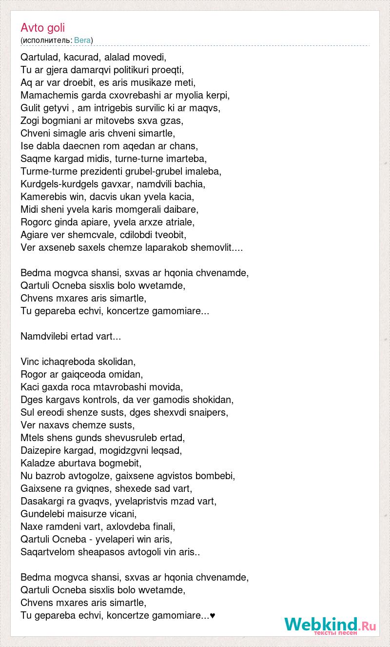 Qartulad, kacurad, alalad movedi, Tu ar gjera damarqvi politikuri proeqti, Aq ar var droebit, es aris musikaze meti, Mamachemis garda cxovrebashi ar myolia kerpi, Gulit getyvi , am intrigebis survilic ki ar maqvs, Zogi bogmiani ar mitovebs sxva gzas, Chveni simagle aris chveni simartle, Ise dabla daecnen rom aqedan ar chans, Saqme kargad midis, turne-turne imarteba, Turme-turme prezidenti grubel-grubel imaleba, Kurdgels-kurdgels gavxar, namdvili bachia, Kamerebis win, dacvis ukan yvela kacia, Midi sheni yvela karis momgerali daibare, Rogorc ginda apiare, yvela arxze atriale, Agiare ver shemcvale, cdilobdi tveobit, Ver axseneb saxels chemze laparakob shemovlit.... Bedma mogvca shansi, sxvas ar hqonia chvenamde, Qartuli Ocneba sisxlis bolo wvetamde, Chvens mxares aris simartle, Tu gepareba echvi, koncertze gamomiare... Namdvilebi ertad vart... Vinc ichaqreboda skolidan, Rogor ar gaiqceoda omidan, Kaci gaxda roca mtavrobashi movida, Dges kargavs kontrols, da ver gamodis shokidan, Sul ereodi shenze susts, dges shexvdi snaipers, Ver naxavs chemze susts, Mtels shens gunds shevusruleb ertad, Daizepire kargad, mogidzgvni leqsad, Kaladze aburtava bogmebit, Nu bazrob avtogolze, gaixsene agvistos bombebi, Gaixsene ra gviqnes, shexede sad vart, Dasakargi ra gvaqvs, yvelapristvis mzad vart, Gundelebi maisurze vicani, Naxe ramdeni vart, axlovdeba finali, Qartuli Ocneba - yvelaperi win aris, Saqartvelom sheapasos avtogoli vin aris.. Bedma mogvca shansi, sxvas ar hqonia chvenamde, Qartuli Ocneba sisxlis bolo wvetamde, Chvens mxares aris simartle, Tu gepareba echvi, koncertze gamomiare...♥
