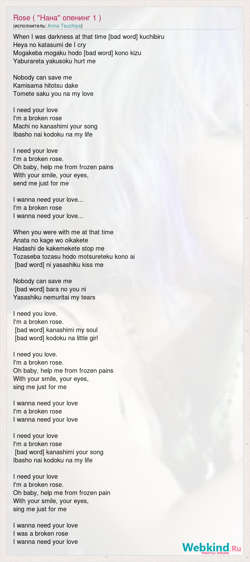 When I was darkness at that time [bad word] kuchibiru Heya no katasumi de I cry Mogakeba mogaku hodo [bad word] kono kizu Yaburareta yakusoku hurt me Nobody can save me Kamisama hitotsu dake Tomete saku you na my love I need your love I'm a broken rose Machi no kanashimi your song Ibasho nai kodoku na my life I need your love I'm a broken rose. Oh baby, help me from frozen pains With your smile, your eyes, send me just for me I wanna need your love... I'm a broken rose I wanna need your love... When you were with me at that time Anata no kage wo oikakete Hadashi de kakemekete stop me Tozaseba tozasu hodo motsureteku kono ai [bad word] ni yasashiku kiss me Nobody can save me [bad word] bara no you ni Yasashiku nemuritai my tears I need you love. I'm a broken rose. [bad word] kanashimi my soul [bad word] kodoku na little girl I need you love. I'm a broken rose. Oh baby, help me from frozen pains With your smile, your eyes, sing me just for me I wanna need your love I'm a broken rose I wanna need your love I need your love I'm a broken rose [bad word] kanashimi your song Ibasho nai kodoku na my life I need your love I'm a broken rose. Oh baby, help me from frozen pain With your smile, your eyes, sing me just for me I wanna need your love I was a broken rose I wanna need your love