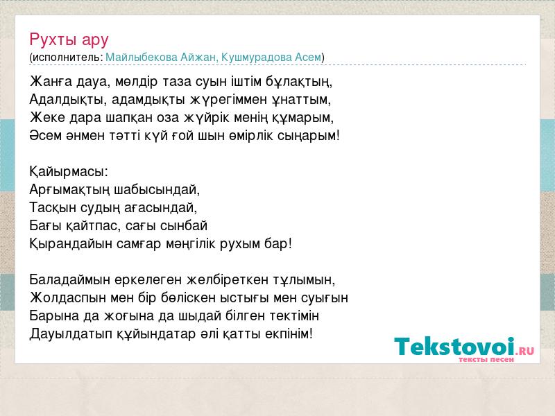 Жанға дауа, мөлдір таза суын іштім бұлақтың, Адалдықты, адамдықты жүрегiммен ұнаттым, Жеке дара шапқан оза жүйрік менің құмарым, Әсем әнмен тәтті күй ғой шын өмірлік сыңарым! Қайырмасы: Арғымақтың шабысындай, Тасқын судың ағасындай, Бағы қайтпас, сағы сынбай Қырандайын самғар мәңгілік рухым бар! Баладаймын еркелеген желбіреткен тұлымын, Жолдаспын мен бір бөліскен ыстығы мен суығын Барына да жоғына да шыдай білген тектімін Дауылдатып құйындатар әлі қатты екпінім!