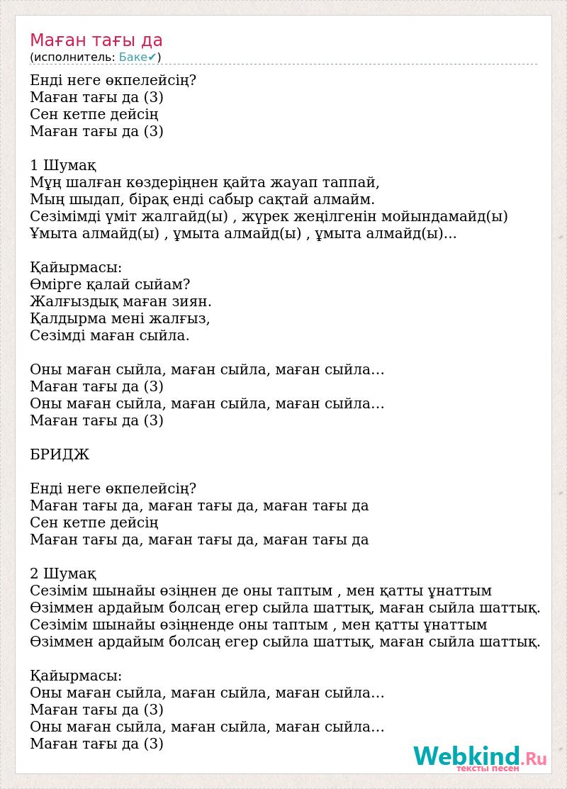 Енді неге өкпелейсің? Маған тағы да (3) Сен кетпе дейсің Маған тағы да (3) 1 Шумақ Мұң шалған көздеріңнен қайта жауап таппай, Мың шыдап, бірақ енді сабыр сақтай алмайм. Сезімімді үміт жалгайд(ы) , жүрек жеңілгенін мойындамайд(ы) Ұмыта алмайд(ы) , ұмыта алмайд(ы) , ұмыта алмайд(ы)... Қайырмасы: Өмірге қалай сыйам? Жалғыздық маған зиян. Қалдырма мені жалғыз, Сезімді маған сыйла. Оны маған сыйла, маған сыйла, маған сыйла… Маған тағы да (3) Оны маған сыйла, маған сыйла, маған сыйла… Маған тағы да (3) БРИДЖ Енді неге өкпелейсің? Маған тағы да, маған тағы да, маған тағы да Сен кетпе дейсің Маған тағы да, маған тағы да, маған тағы да 2 Шумақ Сезімім шынайы өзіңнен де оны таптым , мен қатты ұнаттым Өзіммен ардайым болсаң егер сыйла шаттық, маған сыйла шаттық. Сезімім шынайы өзіңненде оны таптым , мен қатты ұнаттым Өзіммен ардайым болсаң егер сыйла шаттық, маған сыйла шаттық. Қайырмасы: Оны маған сыйла, маған сыйла, маған сыйла… Маған тағы да (3) Оны маған сыйла, маған сыйла, маған сыйла… Маған тағы да (3)