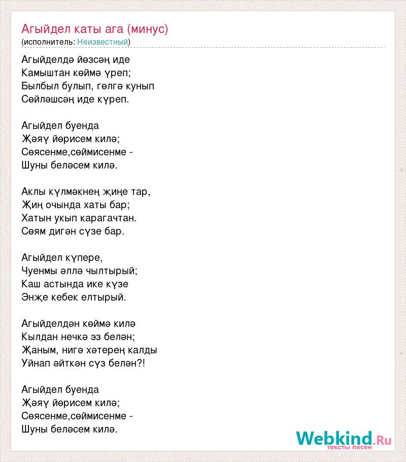 Агыйделдә йөзсәң иде Камыштан көймә үреп; Былбыл булып, гөлгә кунып Сөйләшсәң иде күреп. Агыйдел буенда Җәяү йөрисем килә; Сөясенме,сөймисенме - Шуны беләсем килә. Аклы күлмәкнең җиңе тар, Җиң очында хаты бар; Хатын укып карагачтан. Сөям дигән сүзе бар. Агыйдел күпере, Чуенмы әллә чылтырый; Каш астында ике күзе Энҗе кебек елтырый. Агыйделдән көймә килә Кылдан нечкә эз белән; Җаным, нигә хәтерең калды Уйнап әйткән сүз белән?! Агыйдел буенда Җәяү йөрисем килә; Сөясенме,сөймисенме - Шуны беләсем килә.