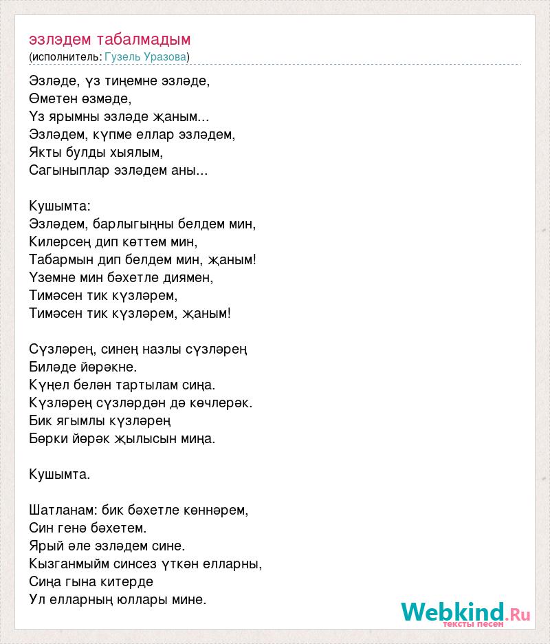 Эзләде, үз тиңемне эзләде, Өметен өзмәде, Үз ярымны эзләде җаным... Эзләдем, күпме еллар эзләдем, Якты булды хыялым, Сагыныплар эзләдем аны... Кушымта: Эзләдем, барлыгыңны белдем мин, Килерсең дип көттем мин, Табармын дип белдем мин, җаным! Үземне мин бәхетле диямен, Тимәсен тик күзләрем, Тимәсен тик күзләрем, җаным! Сүзләрең, синең назлы сүзләрең Биләде йөрәкне. Күңел белән тартылам сиңа. Күзләрең сүзләрдән дә көчлерәк. Бик ягымлы күзләрең Бөрки йөрәк җылысын миңа. Кушымта. Шатланам: бик бәхетле көннәрем, Син генә бәхетем. Ярый әле эзләдем сине. Кызганмыйм синсез үткән елларны, Сиңа гына китерде Ул елларның юллары мине.