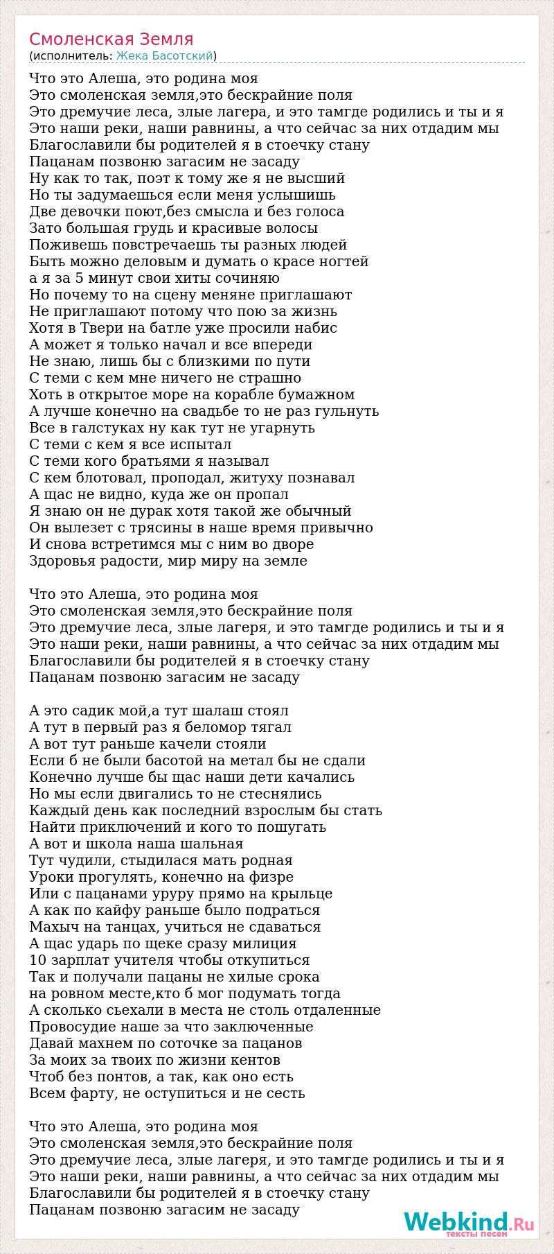 Что это Алеша, это родина моя Это смоленская земля,это бескрайние поля Это дремучие леса, злые лагера, и это тамгде родились и ты и я Это наши реки, наши равнины, а что сейчас за них отдадим мы Благославили бы родителей я в стоечку стану Пацанам позвоню загасим не засаду Ну как то так, поэт к тому же я не высший Но ты задумаешься если меня услышишь Две девочки поют,без смысла и без голоса Зато большая грудь и красивые волосы Поживешь повстречаешь ты разных людей Быть можно деловым и думать о красе ногтей а я за 5 минут свои хиты сочиняю Но почему то на сцену меняне приглашают Не приглашают потому что пою за жизнь Хотя в Твери на батле уже просили набис А может я только начал и все впереди Не знаю, лишь бы с близкими по пути С теми с кем мне ничего не страшно Хоть в открытое море на корабле бумажном А лучше конечно на свадьбе то не раз гульнуть Все в галстуках ну как тут не угарнуть С теми с кем я все испытал С теми кого братьями я называл С кем блотовал, проподал, житуху познавал А щас не видно, куда же он пропал Я знаю он не дурак хотя такой же обычный Он вылезет с трясины в наше время привычно И снова встретимся мы с ним во дворе Здоровья радости, мир миру на земле Что это Алеша, это родина моя Это смоленская земля,это бескрайние поля Это дремучие леса, злые лагеря, и это тамгде родились и ты и я Это наши реки, наши равнины, а что сейчас за них отдадим мы Благославили бы родителей я в стоечку стану Пацанам позвоню загасим не засаду А это садик мой,а тут шалаш стоял А тут в первый раз я беломор тягал А вот тут раньше качели стояли Если б не были басотой на метал бы не сдали Конечно лучше бы щас наши дети качались Но мы если двигались то не стеснялись Каждый день как последний взрослым бы стать Найти приключений и кого то пошугать А вот и школа наша шальная Тут чудили, стыдилася мать родная Уроки прогулять, конечно на физре Или с пацанами уруру прямо на крыльце А как по кайфу раньше было подраться Махыч на танцах, учиться не сдаваться А щас ударь по щеке сразу милиция 10 зарплат учителя чтобы откупиться Так и получали пацаны не хилые срока на ровном месте,кто б мог подумать тогда А сколько сьехали в места не столь отдаленные Провосудие наше за что заключенные Давай махнем по соточке за пацанов За моих за твоих по жизни кентов Чтоб без понтов, а так, как оно есть Всем фарту, не оступиться и не сесть Что это Алеша, это родина моя Это смоленская земля,это бескрайние поля Это дремучие леса, злые лагеря, и это тамгде родились и ты и я Это наши реки, наши равнины, а что сейчас за них отдадим мы Благославили бы родителей я в стоечку стану Пацанам позвоню загасим не засаду