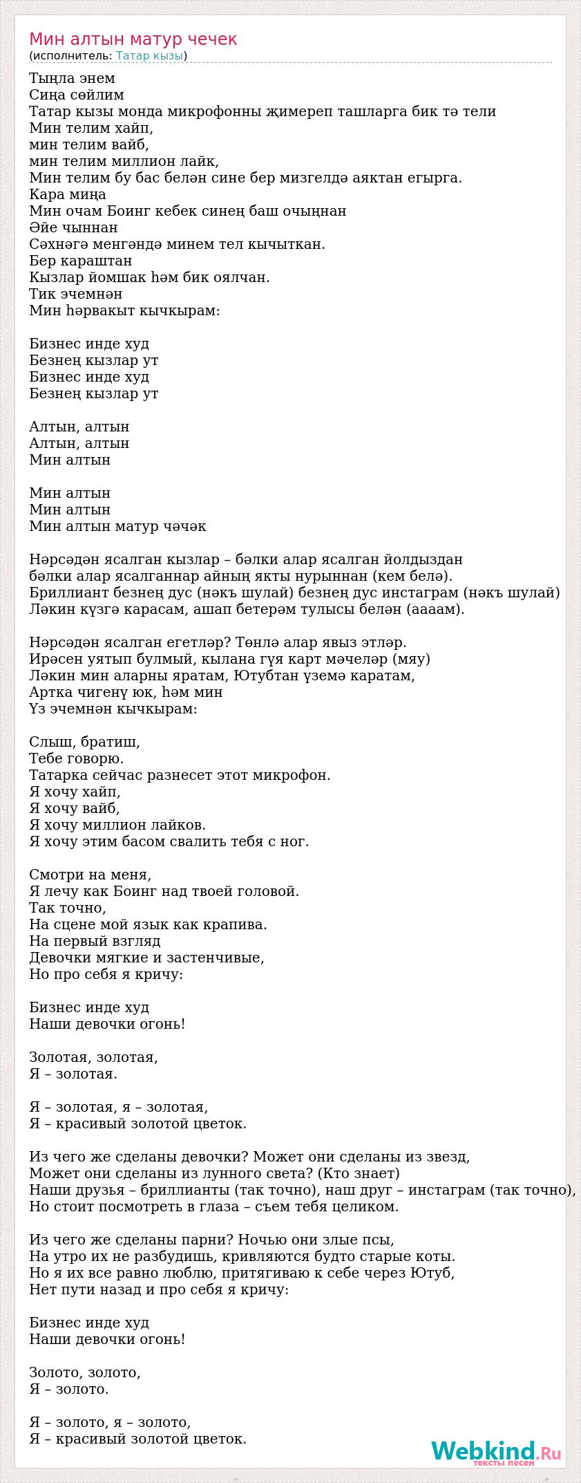 Тыңла энем Сиңа сөйлим Татар кызы монда микрофонны җимереп ташларга бик тә тели Мин телим хайп, мин телим вайб, мин телим миллион лайк, Мин телим бу бас белән сине бер мизгелдә аяктан егырга. Кара миңа Мин очам Боинг кебек синең баш очыңнан Әйе чыннан Сәхнәгә менгәндә минем тел кычыткан. Бер караштан Кызлар йомшак һәм бик оялчан. Тик эчемнән Мин һәрвакыт кычкырам: Бизнес инде худ Безнең кызлар ут Бизнес инде худ Безнең кызлар ут Алтын, алтын Алтын, алтын Мин алтын Мин алтын Мин алтын Мин алтын матур чәчәк Нәрсәдән ясалган кызлар – бәлки алар ясалган йолдыздан бәлки алар ясалганнар айның якты нурыннан (кем белә). Бриллиант безнең дус (нәкъ шулай) безнең дус инстаграм (нәкъ шулай) Ләкин күзгә карасам, ашап бетерәм тулысы белән (аааам). Нәрсәдән ясалган егетләр? Төнлә алар явыз этләр. Ирәсен уятып булмый, кылана гүя карт мәчеләр (мяу) Ләкин мин аларны яратам, Ютубтан үземә каратам, Артка чигенү юк, һәм мин Үз эчемнән кычкырам: Слыш, братиш, Тебе говорю. Татарка сейчас разнесет этот микрофон. Я хочу хайп, Я хочу вайб, Я хочу миллион лайков. Я хочу этим басом свалить тебя с ног. Смотри на меня, Я лечу как Боинг над твоей головой. Так точно, На сцене мой язык как крапива. На первый взгляд Девочки мягкие и застенчивые, Но про себя я кричу: Бизнес инде худ Наши девочки огонь! Золотая, золотая, Я – золотая. Я – золотая, я – золотая, Я – красивый золотой цветок. Из чего же сделаны девочки? Может они сделаны из звезд, Может они сделаны из лунного света? (Кто знает) Наши друзья – бриллианты (так точно), наш друг – инстаграм (так точно), Но стоит посмотреть в глаза – съем тебя целиком. Из чего же сделаны парни? Ночью они злые псы, На утро их не разбудишь, кривляются будто старые коты. Но я их все равно люблю, притягиваю к себе через Ютуб, Нет пути назад и про себя я кричу: Бизнес инде худ Наши девочки огонь! Золото, золото, Я – золото. Я – золото, я – золото, Я – красивый золотой цветок.