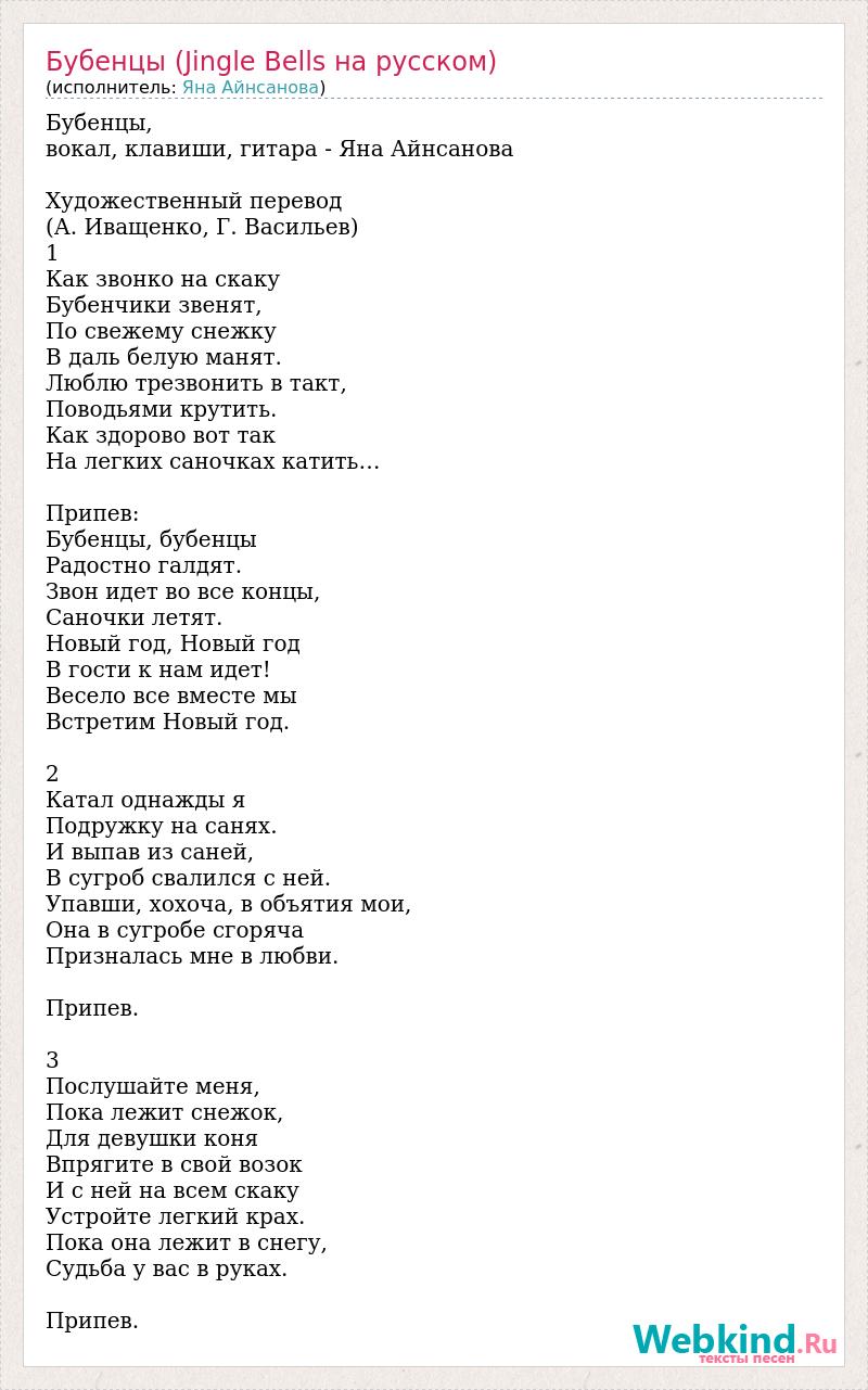 Бубенцы, вокал, клавиши, гитара - Яна Айнсанова Художественный перевод (А. Иващенко, Г. Васильев) 1 Как звонко на скаку Бубенчики звенят, По свежему снежку В даль белую манят. Люблю трезвонить в такт, Поводьями крутить. Как здорово вот так На легких саночках катить… Припев: Бубенцы, бубенцы Радостно галдят. Звон идет во все концы, Саночки летят. Новый год, Новый год В гости к нам идет! Весело все вместе мы Встретим Новый год. 2 Катал однажды я Подружку на санях. И выпав из саней, В сугроб свалился с ней. Упавши, хохоча, в объятия мои, Она в сугробе сгоряча Призналась мне в любви. Припев. 3 Послушайте меня, Пока лежит снежок, Для девушки коня Впрягите в свой возок И с ней на всем скаку Устройте легкий крах. Пока она лежит в снегу, Судьба у вас в руках. Припев.