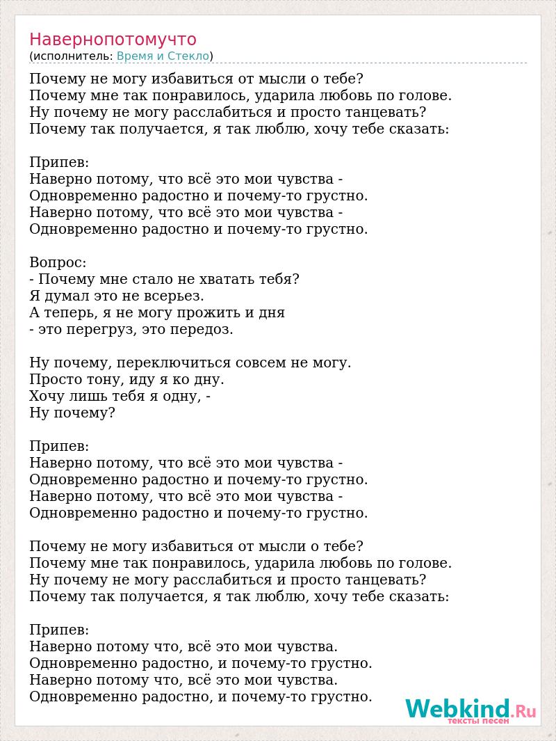 Почему не могу избавиться от мысли о тебе? Почему мне так понравилось, ударила любовь по голове. Ну почему не могу расслабиться и просто танцевать? Почему так получается, я так люблю, хочу тебе сказать: Припев: Наверно потому, что всё это мои чувства - Одновременно радостно и почему-то грустно. Наверно потому, что всё это мои чувства - Одновременно радостно и почему-то грустно. Вопрос: - Почему мне стало не хватать тебя? Я думал это не всерьез. А теперь, я не могу прожить и дня - это перегруз, это передоз. Ну почему, переключиться совсем не могу. Просто тону, иду я ко дну. Хочу лишь тебя я одну, - Ну почему? Припев: Наверно потому, что всё это мои чувства - Одновременно радостно и почему-то грустно. Наверно потому, что всё это мои чувства - Одновременно радостно и почему-то грустно. Почему не могу избавиться от мысли о тебе? Почему мне так понравилось, ударила любовь по голове. Ну почему не могу расслабиться и просто танцевать? Почему так получается, я так люблю, хочу тебе сказать: Припев: Наверно потому что, всё это мои чувства. Одновременно радостно, и почему-то грустно. Наверно потому что, всё это мои чувства. Одновременно радостно, и почему-то грустно.