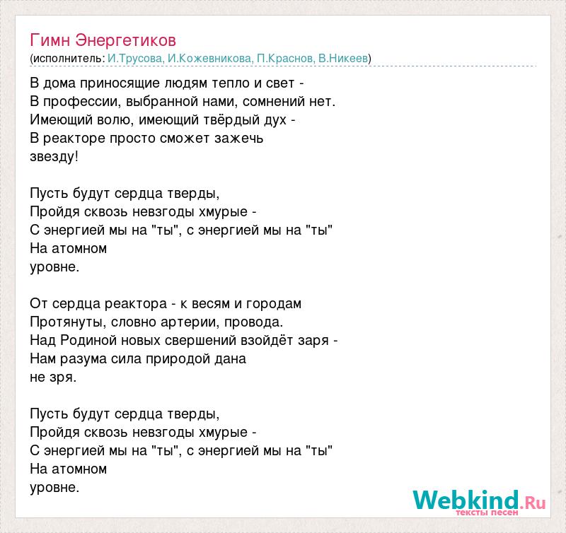 В дома приносящие людям тепло и свет - В профессии, выбранной нами, сомнений нет. Имеющий волю, имеющий твёрдый дух - В реакторе просто сможет зажечь звезду! Пусть будут сердца тверды, Пройдя сквозь невзгоды хмурые - С энергией мы на "ты", с энергией мы на "ты" На атомном уровне. От сердца реактора - к весям и городам Протянуты, словно артерии, провода. Над Родиной новых свершений взойдёт заря - Нам разума сила природой дана не зря. Пусть будут сердца тверды, Пройдя сквозь невзгоды хмурые - С энергией мы на "ты", с энергией мы на "ты" На атомном уровне.