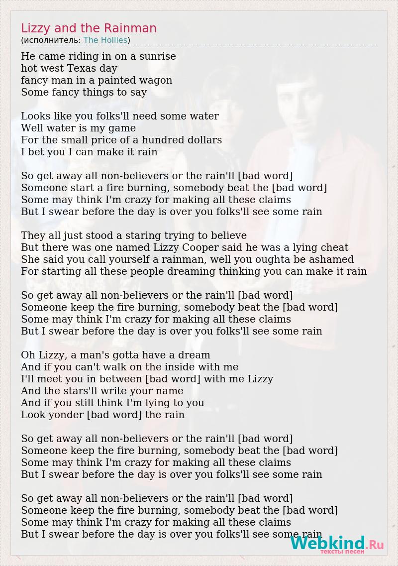 He came riding in on a sunrise hot west Texas day fancy man in a painted wagon Some fancy things to say Looks like you folks'll need some water Well water is my game For the small price of a hundred dollars I bet you I can make it rain So get away all non-believers or the rain'll [bad word] Someone start a fire burning, somebody beat the [bad word] Some may think I'm crazy for making all these claims But I swear before the day is over you folks'll see some rain They all just stood a staring trying to believe But there was one named Lizzy Cooper said he was a lying cheat She said you call yourself a rainman, well you oughta be ashamed For starting all these people dreaming thinking you can make it rain So get away all non-believers or the rain'll [bad word] Someone keep the fire burning, somebody beat the [bad word] Some may think I'm crazy for making all these claims But I swear before the day is over you folks'll see some rain Oh Lizzy, a man's gotta have a dream And if you can't walk on the inside with me I'll meet you in between [bad word] with me Lizzy And the stars'll write your name And if you still think I'm lying to you Look yonder [bad word] the rain So get away all non-believers or the rain'll [bad word] Someone keep the fire burning, somebody beat the [bad word] Some may think I'm crazy for making all these claims But I swear before the day is over you folks'll see some rain So get away all non-believers or the rain'll [bad word] Someone keep the fire burning, somebody beat the [bad word] Some may think I'm crazy for making all these claims But I swear before the day is over you folks'll see some rain