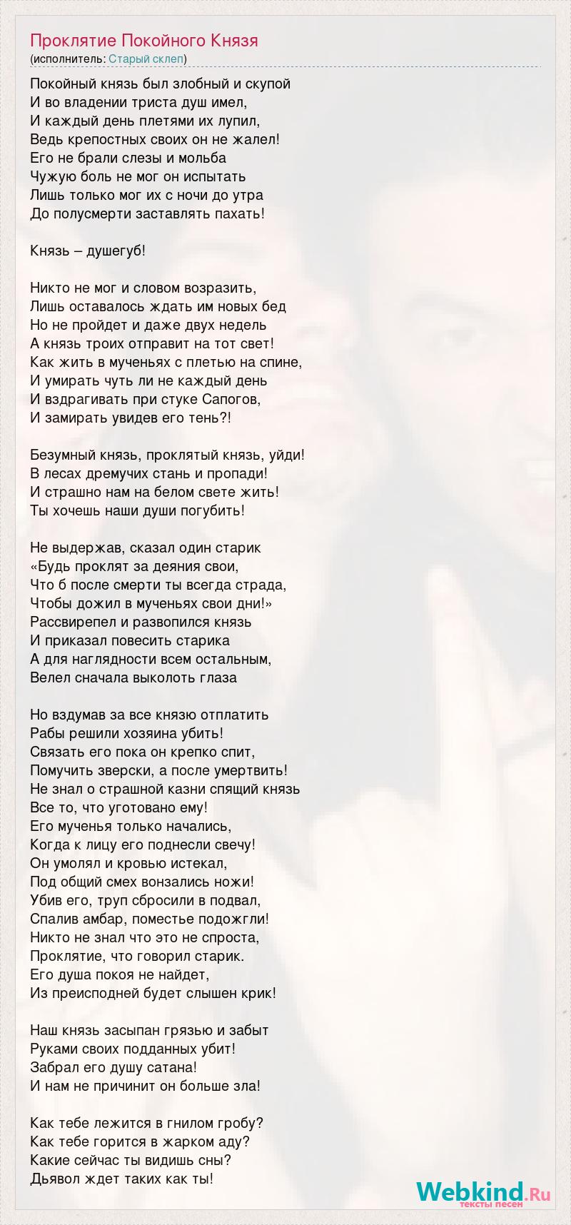 Покойный князь был злобный и скупой И во владении триста душ имел, И каждый день плетями их лупил, Ведь крепостных своих он не жалел! Его не брали слезы и мольба Чужую боль не мог он испытать Лишь только мог их с ночи до утра До полусмерти заставлять пахать! Князь – душегуб! Никто не мог и словом возразить, Лишь оставалось ждать им новых бед Но не пройдет и даже двух недель А князь троих отправит на тот свет! Как жить в мученьях с плетью на спине, И умирать чуть ли не каждый день И вздрагивать при стуке Сапогов, И замирать увидев его тень?! Безумный князь, проклятый князь, уйди! В лесах дремучих стань и пропади! И страшно нам на белом свете жить! Ты хочешь наши души погубить! Не выдержав, сказал один старик «Будь проклят за деяния свои, Что б после смерти ты всегда страда, Чтобы дожил в мученьях свои дни!» Рассвирепел и развопился князь И приказал повесить старика А для наглядности всем остальным, Велел сначала выколоть глаза Но вздумав за все князю отплатить Рабы решили хозяина убить! Связать его пока он крепко спит, Помучить зверски, а после умертвить! Не знал о страшной казни спящий князь Все то, что уготовано ему! Его мученья только начались, Когда к лицу его поднесли свечу! Он умолял и кровью истекал, Под общий смех вонзались ножи! Убив его, труп сбросили в подвал, Спалив амбар, поместье подожгли! Никто не знал что это не спроста, Проклятие, что говорил старик. Его душа покоя не найдет, Из преисподней будет слышен крик! Наш князь засыпан грязью и забыт Руками своих подданных убит! Забрал его душу сатана! И нам не причинит он больше зла! Как тебе лежится в гнилом гробу? Как тебе горится в жарком аду? Какие сейчас ты видишь сны? Дьявол ждет таких как ты!