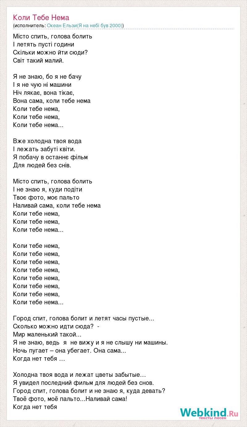 Мiсто спить, голова болить I летять пустi години Скiльки можно йти сюди? Свiт такий малий. Я не знаю, бо я не бачу I я не чую нi машини Нiч лякає, вона тiкає, Вона сама, коли тебе нема Коли тебе нема, Коли тебе нема, Коли тебе нема... Вже холодна твоя вода I лежать забутi квiти. Я побачу в останнє фiльм Для людей без снiв. Мiсто спить, голова болить I не знаю я, куди подiти Твоє фото, моє пальто Наливай сама, коли тебе нема Коли тебе нема, Коли тебе нема, Коли тебе нема... Коли тебе нема, Коли тебе нема, Коли тебе нема, Коли тебе нема, Коли тебе нема, Коли тебе нема, Коли тебе нема, Коли тебе нема... Город спит, голова болит и летят часы пустые... Сколько можно идти сюда? - Мир маленький такой... Я не знаю, ведь я не вижу и я не слышу ни машины. Ночь пугает – она убегает. Она сама... Когда нет тебя … Холодна твоя вода и лежат цветы забытые… Я увидел последний фильм для людей без снов. Город спит, голова болит и не знаю я, куда девать? Твоё фото, моё пальто...Наливай сама! Когда нет тебя