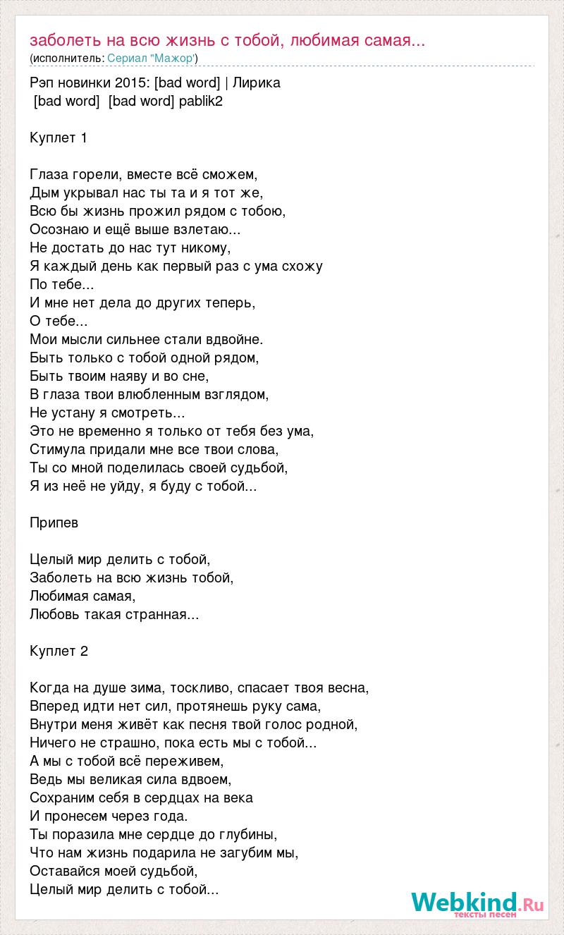 Рэп новинки 2015: [bad word] | Лирика [bad word] [bad word] pablik2 Куплет 1 Глаза горели, вместе всё сможем, Дым укрывал нас ты та и я тот же, Всю бы жизнь прожил рядом с тобою, Осознаю и ещё выше взлетаю... Не достать до нас тут никому, Я каждый день как первый раз с ума схожу По тебе... И мне нет дела до других теперь, О тебе... Мои мысли сильнее стали вдвойне. Быть только с тобой одной рядом, Быть твоим наяву и во сне, В глаза твои влюбленным взглядом, Не устану я смотреть... Это не временно я только от тебя без ума, Стимула придали мне все твои слова, Ты со мной поделилась своей судьбой, Я из неё не уйду, я буду с тобой... Припев Целый мир делить с тобой, Заболеть на всю жизнь тобой, Любимая самая, Любовь такая странная... Куплет 2 Когда на душе зима, тоскливо, спасает твоя весна, Вперед идти нет сил, протянешь руку сама, Внутри меня живёт как песня твой голос родной, Ничего не страшно, пока есть мы с тобой... А мы с тобой всё переживем, Ведь мы великая сила вдвоем, Сохраним себя в сердцах на века И пронесем через года. Ты поразила мне сердце до глубины, Что нам жизнь подарила не загубим мы, Оставайся моей судьбой, Целый мир делить с тобой...