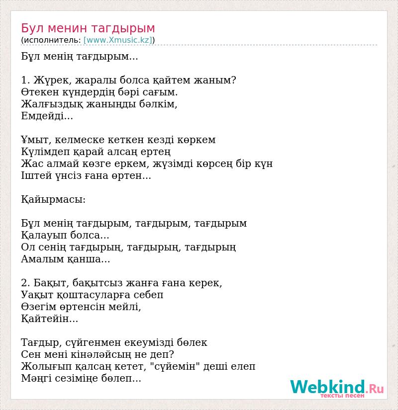 Бұл менің тағдырым... 1. Жүрек, жаралы болса қайтем жаным? Өтекен күндердің бәрі сағым. Жалғыздық жаныңды бәлкім, Емдейді... Ұмыт, келмеске кеткен кезді көркем Күлімдеп қарай алсаң ертең Жас алмай көзге еркем, жүзімді көрсең бір күн Іштей үнсіз ғана өртен... Қайырмасы: Бұл менің тағдырым, тағдырым, тағдырым Қалауып болса... Ол сенің тағдырың, тағдырың, тағдырың Амалым қанша... 2. Бақыт, бақытсыз жанға ғана керек, Уақыт қоштасуларға себеп Өзегім өртенсін мейлі, Қайтейін... Тағдыр, сүйгенмен екеумізді бөлек Сен мені кінәләйсың не деп? Жолығып қалсаң кетет, "сүйемін" деші елеп Мәңгі сезіміңе бөлеп...