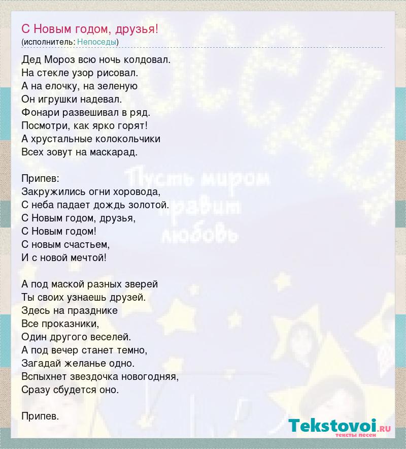 Дед Мороз всю ночь колдовал. На стекле узор рисовал. А на елочку, на зеленую Он игрушки надевал. Фонари развешивал в ряд. Посмотри, как ярко горят! А хрустальные колокольчики Всех зовут на маскарад. Припев: Закружились огни хоровода, С неба падает дождь золотой. С Новым годом, друзья, С Новым годом! С новым счастьем, И с новой мечтой! А под маской разных зверей Ты своих узнаешь друзей. Здесь на празднике Все проказники, Один другого веселей. А под вечер станет темно, Загадай желанье одно. Вспыхнет звездочка новогодняя, Сразу сбудется оно. Припев.