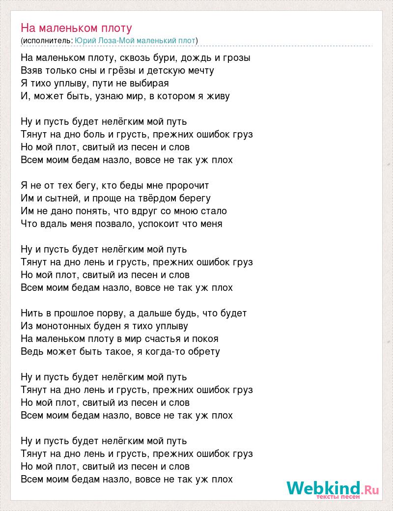 На маленьком плоту, сквозь бури, дождь и грозы Взяв только сны и грёзы и детскую мечту Я тихо уплыву, пути не выбирая И, может быть, узнаю мир, в котором я живу Ну и пусть будет нелёгким мой путь Тянут на дно боль и грусть, прежних ошибок груз Но мой плот, свитый из песен и слов Всем моим бедам назло, вовсе не так уж плох Я не от тех бегу, кто беды мне пророчит Им и сытней, и проще на твёрдом берегу Им не дано понять, что вдруг со мною стало Что вдаль меня позвало, успокоит что меня Ну и пусть будет нелёгким мой путь Тянут на дно лень и грусть, прежних ошибок груз Но мой плот, свитый из песен и слов Всем моим бедам назло, вовсе не так уж плох Нить в прошлое порву, а дальше будь, что будет Из монотонных буден я тихо уплыву На маленьком плоту в мир счастья и покоя Ведь может быть такое, я когда-то обрету Ну и пусть будет нелёгким мой путь Тянут на дно лень и грусть, прежних ошибок груз Но мой плот, свитый из песен и слов Всем моим бедам назло, вовсе не так уж плох Ну и пусть будет нелёгким мой путь Тянут на дно лень и грусть, прежних ошибок груз Но мой плот, свитый из песен и слов Всем моим бедам назло, вовсе не так уж плох