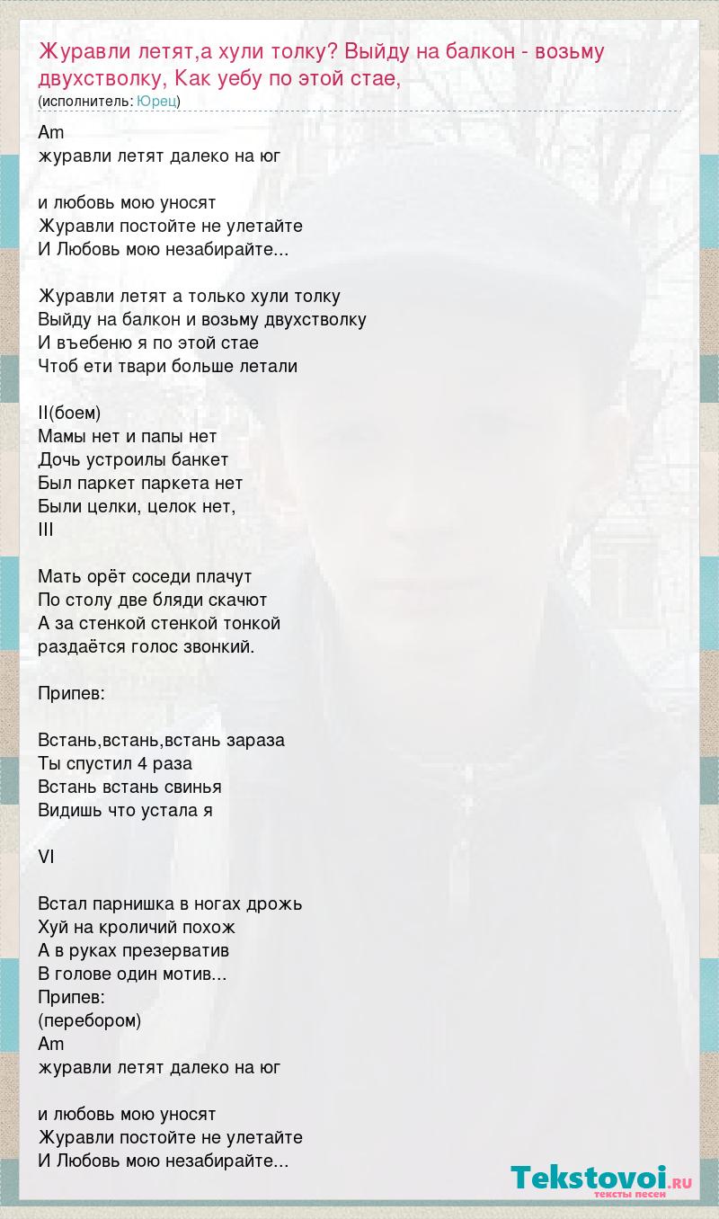 Аm журавли летят далеко на юг и любовь мою уносят Журавли постойте не улетайте И Любовь мою незабирайте... Журавли летят а только хули толку Выйду на балкон и возьму двухстволку И въебеню я по этой стае Чтоб ети твари больше летали II(боем) Мамы нет и папы нет Дочь устроилы банкет Был паркет паркета нет Были целки, целок нет, III Мать орёт соседи плачут По столу две бляди скачют А за стенкой стенкой тонкой раздаётся голос звонкий. Припев: Встань,встань,встань зараза Ты спустил 4 раза Встань встань свинья Видишь что устала я VI Встал парнишка в ногах дрожь Хуй на кроличий похож А в руках презерватив В голове один мотив... Припев: (перебором) Аm журавли летят далеко на юг и любовь мою уносят Журавли постойте не улетайте И Любовь мою незабирайте...