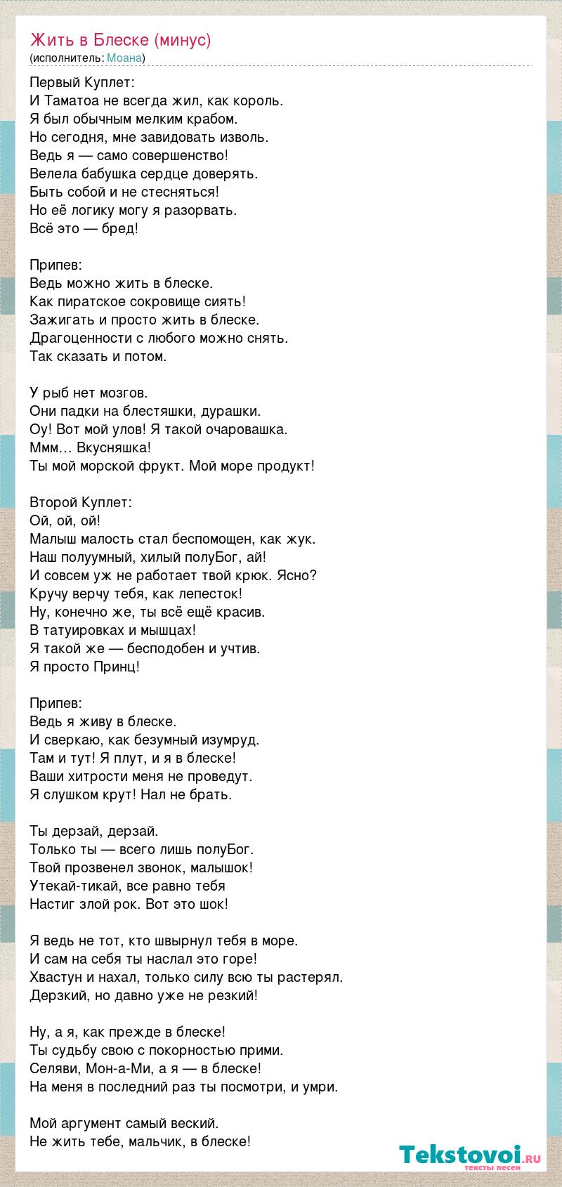 Первый Куплет: И Таматоа не всегда жил, как король. Я был обычным мелким крабом. Но сегодня, мне завидовать изволь. Ведь я — само совершенство! Велела бабушка сердце доверять. Быть собой и не стесняться! Но её логику могу я разорвать. Всё это — бред! Припев: Ведь можно жить в блеске. Как пиратское сокровище сиять! Зажигать и просто жить в блеске. Драгоценности с любого можно снять. Так сказать и потом. У рыб нет мозгов. Они падки на блестяшки, дурашки. Оу! Вот мой улов! Я такой очаровашка. Ммм… Вкусняшка! Ты мой морской фрукт. Мой море продукт! Второй Куплет: Ой, ой, ой! Малыш малость стал беспомощен, как жук. Наш полуумный, хилый полуБог, ай! И совсем уж не работает твой крюк. Ясно? Кручу верчу тебя, как лепесток! Ну, конечно же, ты всё ещё красив. В татуировках и мышцах! Я такой же — бесподобен и учтив. Я просто Принц! Припев: Ведь я живу в блеске. И сверкаю, как безумный изумруд. Там и тут! Я плут, и я в блеске! Ваши хитрости меня не проведут. Я слушком крут! Нал не брать. Ты дерзай, дерзай. Только ты — всего лишь полуБог. Твой прозвенел звонок, малышок! Утекай-тикай, все равно тебя Настиг злой рок. Вот это шок! Я ведь не тот, кто швырнул тебя в море. И сам на себя ты наслал это горе! Хвастун и нахал, только силу всю ты растерял. Дерзкий, но давно уже не резкий! Ну, а я, как прежде в блеске! Ты судьбу свою с покорностью прими. Селяви, Мон-а-Ми, а я — в блеске! На меня в последний раз ты посмотри, и умри. Мой аргумент самый веский. Не жить тебе, мальчик, в блеске!