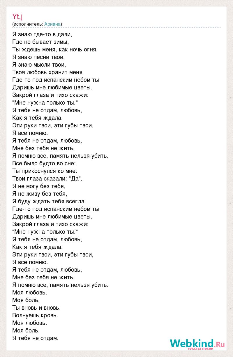 Я знаю где-то в дали, Где не бывает зимы, Ты ждешь меня, как ночь огня. Я знаю песни твои, Я знаю мысли твои, Твоя любовь хранит меня Где-то под испанским небом ты Даришь мне любимые цветы. Закрой глаза и тихо скажи: "Мне нужна только ты." Я тебя не отдам, любовь, Как я тебя ждала. Эти руки твои, эти губы твои, Я все помню. Я тебя не отдам, любовь, Мне без тебя не жить. Я помню все, память нельзя убить. Все было будто во сне: Ты прикоснулся ко мне: Твои глаза сказали: "Да". Я не могу без тебя, Я не живу без тебя, Я буду ждать тебя всегда. Где-то под испанским небом ты Даришь мне любимые цветы. Закрой глаза и тихо скажи: "Мне нужна только ты." Я тебя не отдам, любовь, Как я тебя ждала. Эти руки твои, эти губы твои, Я все помню. Я тебя не отдам, любовь, Мне без тебя не жить. Я помню все, память нельзя убить. Моя любовь. Моя боль. Ты вновь и вновь. Волнуешь кровь. Моя любовь. Моя боль. Я тебя не отдам.
