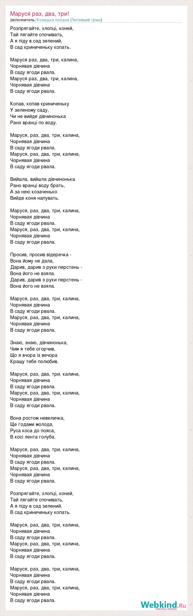 Розпрягайте, хлопцi, коней, Тай лягайте спочивать, А я пiду в сад зелений, В сад криниченьку копать. Маруся раз, два, три, калина, Чорнявая дiвчина В саду ягоди рвала. Маруся раз, два, три, калина, Чорнявая дiвчина В саду ягоди рвала. Копав, копав криниченьку У зеленому саду, Чи не вийде дiвчинонька Рано вранцi по воду. Маруся, раз, два, три, калина, Чорнявая дiвчина В саду ягоди рвала. Маруся, раз, два, три, калина, Чорнявая дiвчина В саду ягоди рвала. Вийшла, вийшла дiвчинонька Рано вранцi воду брать, А за нею козаченько Вийде коня напувать. Маруся, раз, два, три, калина, Чорнявая дiвчина В саду ягоди рвала. Маруся, раз, два, три, калина, Чорнявая дiвчина В саду ягоди рвала. Просив, просив відеречка - Вона йому не дала, Дарив, дарив з руки перстень - Вона його не взяла. Дарив, дарив з руки перстень - Вона його не взяла. Маруся, раз, два, три, калина, Чорнявая дiвчина В саду ягоди рвала. Маруся, раз, два, три, калина, Чорнявая дiвчина В саду ягоди рвала. Знаю, знаю, дiвчинонька, Чим я тебе огорчив, Що я вчора із вечора Кращу тебе полюбив. Маруся, раз, два, три, калина, Чорнявая дiвчина В саду ягоди рвала. Маруся, раз, два, три, калина, Чорнявая дiвчина В саду ягоди рвала. Вона ростом невеличка, Ще годами молода, Руса коса до пояса, В косi лента голуба. Маруся, раз, два, три, калина, Чорнявая дiвчина В саду ягоди рвала. Маруся, раз, два, три, калина, Чорнявая дiвчина В саду ягоди рвала. Розпрягайте, хлопцi, коней, Тай лягайте спочивать, А я пiду в сад зелений, В сад криниченьку копать. Маруся, раз, два, три, калина, Чорнявая дiвчина В саду ягоди рвала. Маруся, раз, два, три, калина, Чорнявая дiвчина В саду ягоди рвала. Маруся, раз, два, три, калина, Чорнявая дiвчина В саду ягоди рвала. Маруся, раз, два, три, калина, Чорнявая дiвчина В саду ягоди рвала.