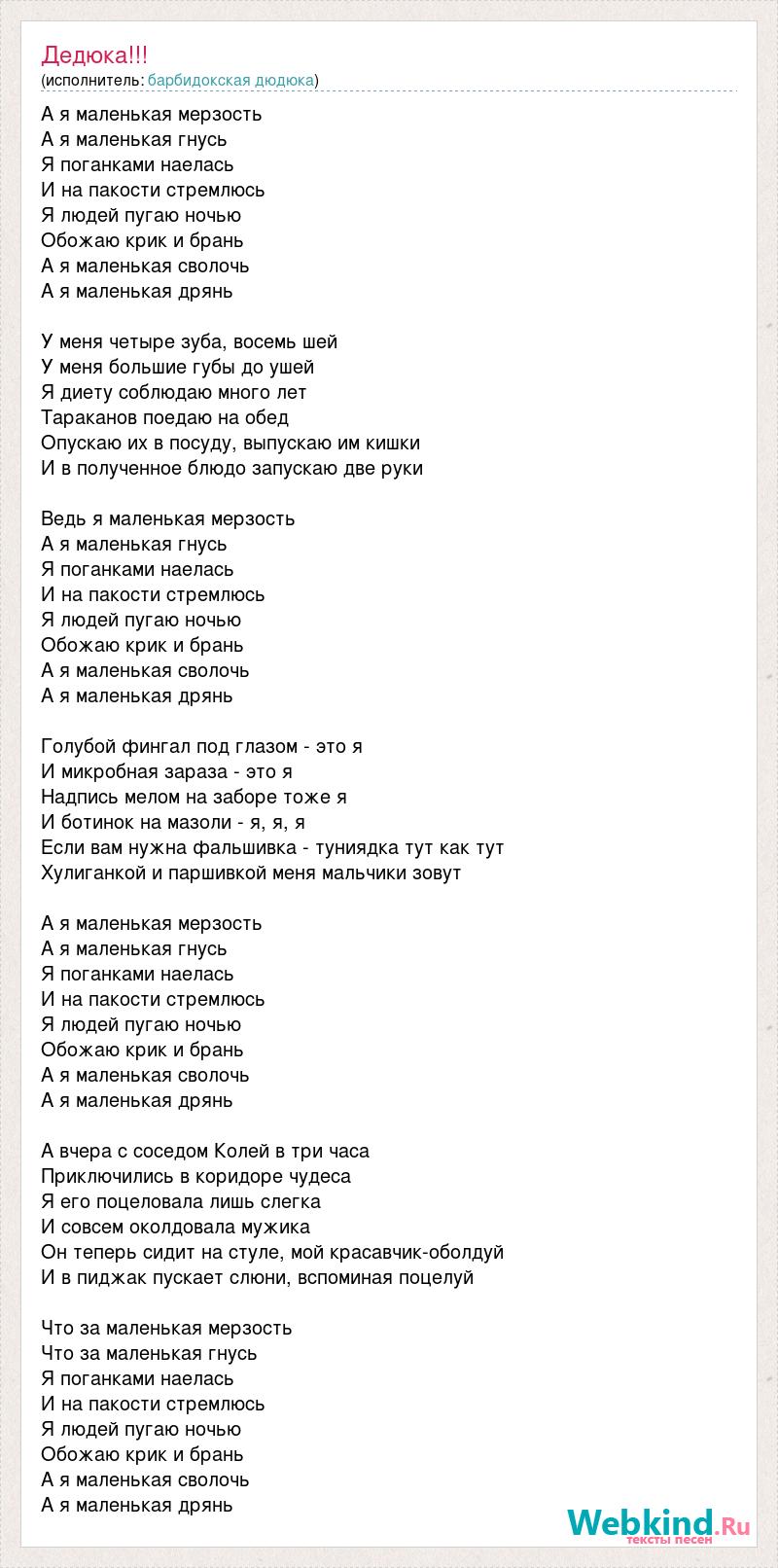 А я маленькая мерзость А я маленькая гнусь Я поганками наелась И на пакости стремлюсь Я людей пугаю ночью Обожаю крик и брань А я маленькая сволочь А я маленькая дрянь У меня четыре зуба, восемь шей У меня большие губы до ушей Я диету соблюдаю много лет Тараканов поедаю на обед Опускаю их в посуду, выпускаю им кишки И в полученное блюдо запускаю две руки Ведь я маленькая мерзость А я маленькая гнусь Я поганками наелась И на пакости стремлюсь Я людей пугаю ночью Обожаю крик и брань А я маленькая сволочь А я маленькая дрянь Голубой фингал под глазом - это я И микробная зараза - это я Надпись мелом на заборе тоже я И ботинок на мазоли - я, я, я Если вам нужна фальшивка - туниядка тут как тут Хулиганкой и паршивкой меня мальчики зовут А я маленькая мерзость А я маленькая гнусь Я поганками наелась И на пакости стремлюсь Я людей пугаю ночью Обожаю крик и брань А я маленькая сволочь А я маленькая дрянь А вчера с соседом Колей в три часа Приключились в коридоре чудеса Я его поцеловала лишь слегка И совсем околдовала мужика Он теперь сидит на стуле, мой красавчик-оболдуй И в пиджак пускает слюни, вспоминая поцелуй Что за маленькая мерзость Что за маленькая гнусь Я поганками наелась И на пакости стремлюсь Я людей пугаю ночью Обожаю крик и брань А я маленькая сволочь А я маленькая дрянь