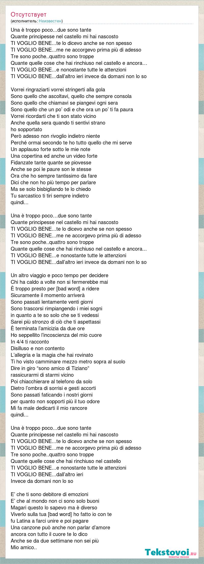 Una è troppo poco...due sono tante Quante principesse nel castello mi hai nascosto TI VOGLIO BENE...te lo dicevo anche se non spesso TI VOGLIO BENE...me ne accorgevo prima più di adesso Tre sono poche..quattro sono troppe Quante quelle cose che hai rinchiuso nel castello e ancora… TI VOGLIO BENE...e nonostante tutte le attenzioni TI VOGLIO BENE...dall’altro ieri invece da domani non lo so Vorrei ringraziarti vorrei stringerti alla gola Sono quello che ascoltavi, quello che sempre consola Sono quello che chiamavi se piangevi ogni sera Sono quello che un po’ odi e che ora un po’ ti fa paura Vorrei ricordarti che ti son stato vicino Anche quella sera quando ti sentivi strano ho sopportato Però adesso non rivoglio indietro niente Perché ormai secondo te ho tutto quello che mi serve Un applauso forte sotto le mie note Una copertina ed anche un video forte Fidanzate tante quante se piovesse Anche se poi le paure son le stesse Ora che ho sempre tantissimo da fare Dici che non ho più tempo per parlare Ma se solo bisbigliando te lo chiedo Tu sarcastico ti tiri sempre indietro quindi... Una è troppo poco…due sono tante Quante principesse nel castello mi hai nascosto TI VOGLIO BENE...te lo dicevo anche se non spesso TI VOGLIO BENE...me ne accorgevo prima più di adesso Tre sono poche..quattro sono troppe Quante quelle cose che hai rinchiuso nel castello e ancora... TI VOGLIO BENE...e nonostante tutte le attenzioni TI VOGLIO BENE...dall’altro ieri invece da domani non lo so Un altro viaggio e poco tempo per decidere Chi ha caldo a volte non si fermerebbe mai È troppo presto per ricominciare a ridere Sicuramente il momento arriverà Sono passati lentamente venti giorni Sono trascorsi rimpiangendo i miei sogni in quanto a te so solo che se ti vedessi Sarei più stronzo di ciò che ti aspettassi È terminata l’amicizia da due ore Ho seppellito l’incoscienza del mio cuore In 4/4 ti racconto Disilluso e non contento L’allegria e la magia che hai rovinato Ti ho visto camminare mezzo metro sopra al suolo Dire in giro “sono amico di Tiziano” rassicurarmi di starmi vicino Poi chiacchierare al telefono da solo Dietro l’ombra di sorrisi e gesti accorti Sono passati faticando i nostri giorni per quanto non sopporti più il tuo odore Mi fa male dedicarti il mio rancore quindi... Una è troppo poco...due sono tante Quante principesse nel castello mi hai nascosto TI VOGLIO BENE...te lo dicevo anche se non spesso TI VOGLIO BENE...me ne accorgevo prima più di adesso Tre sono poche..quattro sono troppe Quante quelle cose che hai rinchiuso nel castello TI VOGLIO BENE...e nonostante tutte le attenzioni TI VOGLIO BENE...dall’altro ieri Invece da domani non lo so E’ che ti sono debitore di emozioni E’ che al mondo non ci sono solo buoni Magari questo lo sapevo ma è diverso Viverlo sulla tua pelle come ho fatto io con te fu Latina a farci unire e poi pagare Una canzone può anche non parlar d’amore ancora con tutto il cuore te lo dico Anche se da due settimane non sei più Mio amico..