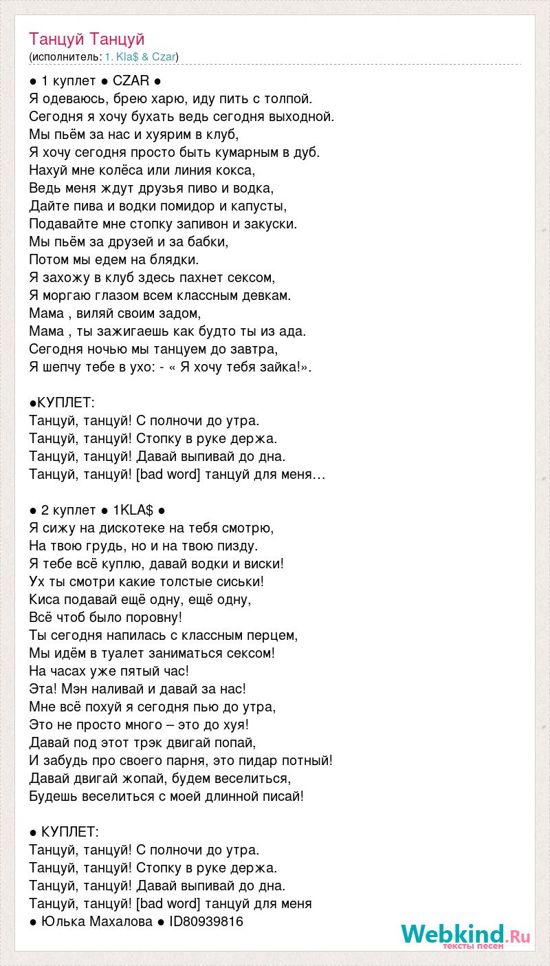 ● 1 куплет ● CZAR ● Я одеваюсь, брею харю, иду пить с толпой. Сегодня я хочу бухать ведь сегодня выходной. Мы пьём за нас и хуярим в клуб, Я хочу сегодня просто быть кумарным в дуб. Нахуй мне колёса или линия кокса, Ведь меня ждут друзья пиво и водка, Дайте пива и водки помидор и капусты, Подавайте мне стопку запивон и закуски. Мы пьём за друзей и за бабки, Потом мы едем на блядки. Я захожу в клуб здесь пахнет сексом, Я моргаю глазом всем классным девкам. Мама , виляй своим задом, Мама , ты зажигаешь как будто ты из ада. Сегодня ночью мы танцуем до завтра, Я шепчу тебе в ухо: - « Я хочу тебя зайка!». ●КУПЛЕТ: Танцуй, танцуй! С полночи до утра. Танцуй, танцуй! Стопку в руке держа. Танцуй, танцуй! Давай выпивай до дна. Танцуй, танцуй! [bad word] танцуй для меня… ● 2 куплет ● 1KLA$ ● Я сижу на дискотеке на тебя смотрю, На твою грудь, но и на твою пизду. Я тебе всё куплю, давай водки и виски! Ух ты смотри какие толстые сиськи! Киса подавай ещё одну, ещё одну, Всё чтоб было поровну! Ты сегодня напилась с классным перцем, Мы идём в туалет заниматься сексом! На часах уже пятый час! Эта! Мэн наливай и давай за нас! Мне всё похуй я сегодня пью до утра, Это не просто много – это до хуя! Давай под этот трэк двигай попай, И забудь про своего парня, это пидар потный! Давай двигай жопай, будем веселиться, Будешь веселиться с моей длинной писай! ● КУПЛЕТ: Танцуй, танцуй! С полночи до утра. Танцуй, танцуй! Стопку в руке держа. Танцуй, танцуй! Давай выпивай до дна. Танцуй, танцуй! [bad word] танцуй для меня ● Юлька Махалова ● ID80939816