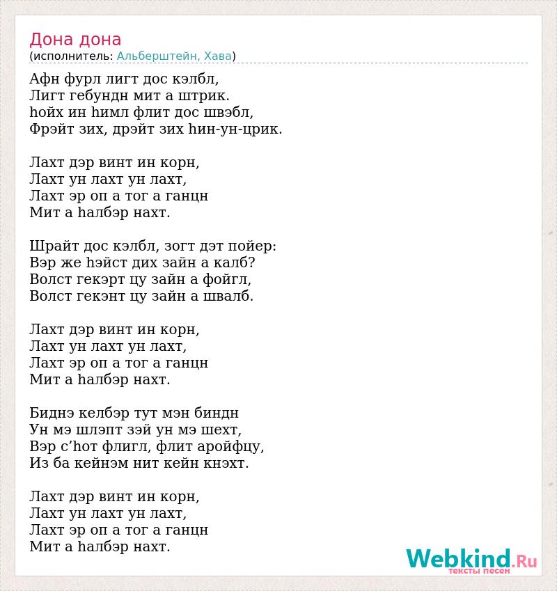 Афн фурл лигт дос кэлбл, Лигт гебундн мит а штрик. hойх ин hимл флит дос швэбл, Фрэйт зих, дрэйт зих hин-ун-црик. Лахт дэр винт ин корн, Лахт ун лахт ун лахт, Лахт эр оп а тог а ганцн Мит а hалбэр нахт. Шрайт дос кэлбл, зогт дэт пойер: Вэр же hэйст дих зайн а калб? Волст гекэрт цу зайн а фойгл, Волст гекэнт цу зайн а швалб. Лахт дэр винт ин корн, Лахт ун лахт ун лахт, Лахт эр оп а тог а ганцн Мит а hалбэр нахт. Биднэ келбэр тут мэн биндн Ун мэ шлэпт зэй ун мэ шехт, Вэр с’hот флигл, флит аройфцу, Из ба кейнэм нит кейн кнэхт. Лахт дэр винт ин корн, Лахт ун лахт ун лахт, Лахт эр оп а тог а ганцн Мит а hалбэр нахт.