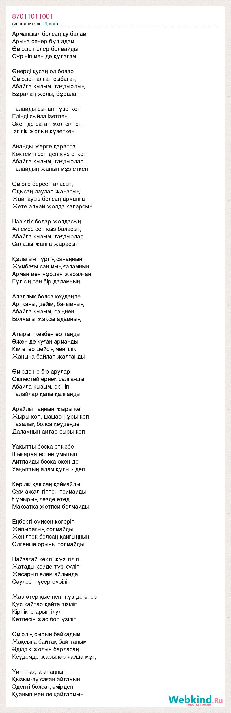 Арманшыл болсаң қу балам Арына сенер бұл адам Өмірде нелер болмайды Сүрініп мен де құлағам Өнерді қусаң ол болар Өмірден алған сыбағаң Абайла қызым, тағдырдың Бұралаң жолы, бұралаң Талайды сынап түзеткен Еліңді сыйла ізетпен Әкең де саған жол сілтеп Ізгілік жолын күзеткен Анаңды жерге қаратпа Көктемін сен деп күз еткен Абайла қызым, тағдырлар Талайдың жанын мұз еткен Өмірге берсең аласың Оқысаң лаулап жанасың Жайпауыз болсаң арманға Жете алмай жолда қаларсың Нәзіктік болар жолдасың Ұл емес сен қыз баласың Абайла қызым, тағдырлар Салады жанға жарасын Құлағын түргің санаңның Жұмбағы сан мың ғаламның Арман мен нұрдан жаралған Гүлісің сен бір даламның Адалдық болса кеудеңде Артқаны, дәйім, бағымның Абайла қызым, өзіңнен Болмағы жақсы адамның Атырып көзбен әр таңды Әжең де қуған арманды Кім өтер дейсің мәңгілік Жанына байлап жалғанды Өмірде не бір арулар Өшпестей өрнек салғанды Абайла қызым, өкініп Талайлар қапы қалғанды Арайлы таңның жыры көп Жыры көп, шашар нұры көп Тазалық болса кеудеңде Даламның айтар сыры көп Уақытты босқа өткізбе Шығарма естен ұмытып Айтпайды босқа әкең де Уақыттың адам құлы - деп Кәрілік қашсаң қоймайды Сұм ажал тіптен тоймайды Ғұмырың лезде өтеді Мақсатқа жетпей болмайды Еңбекті сүйсең көгеріп Жапырағың солмайды Жеңілтек болсаң қайғыңның Өлгенше орыны толмайды Найзағай көкті жүз тіліп Жатады кейде түз күліп Жасарып әлем айдында Сәулесі түсер сүзіліп Жаз өтер қыс пен, күз де өтер Құс қайтар қайта тізіліп Кірпікте арың ілулі Кетпесін жас боп үзіліп Өмірдің сырын байқадым Жақсыға байтақ бай таным Әділдік жолын барласаң Кеудемде жарылар қайда мұң Үмітін ақта анаңның Қызым-ау саған айтамын Әдепті болсаң өмірден Қуанып мен де қайтармын