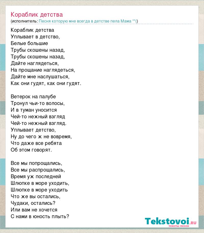 Кораблик детства Уплывает в детство, Белые большие Трубы скошены назад, Трубы скошены назад, Дайте наглядеться, На прощание наглядеться, Дайте мне наслушаться, Как они гудят, как они гудят. Ветерок на палубе Тронул чьи-то волосы, И в туман уносится Чей-то нежный взгляд Чей-то нежный взгляд. Уплывает детство, Ну до чего ж не вовремя, Что даже все ребята Об этом говорят. Все мы попрощались, Все мы распрощались, Время уж последней Шлюпке в море уходить, Шлюпке в море уходить Что же вы остались, Чудаки, остались? Или вам не хочется С нами в юность плыть?