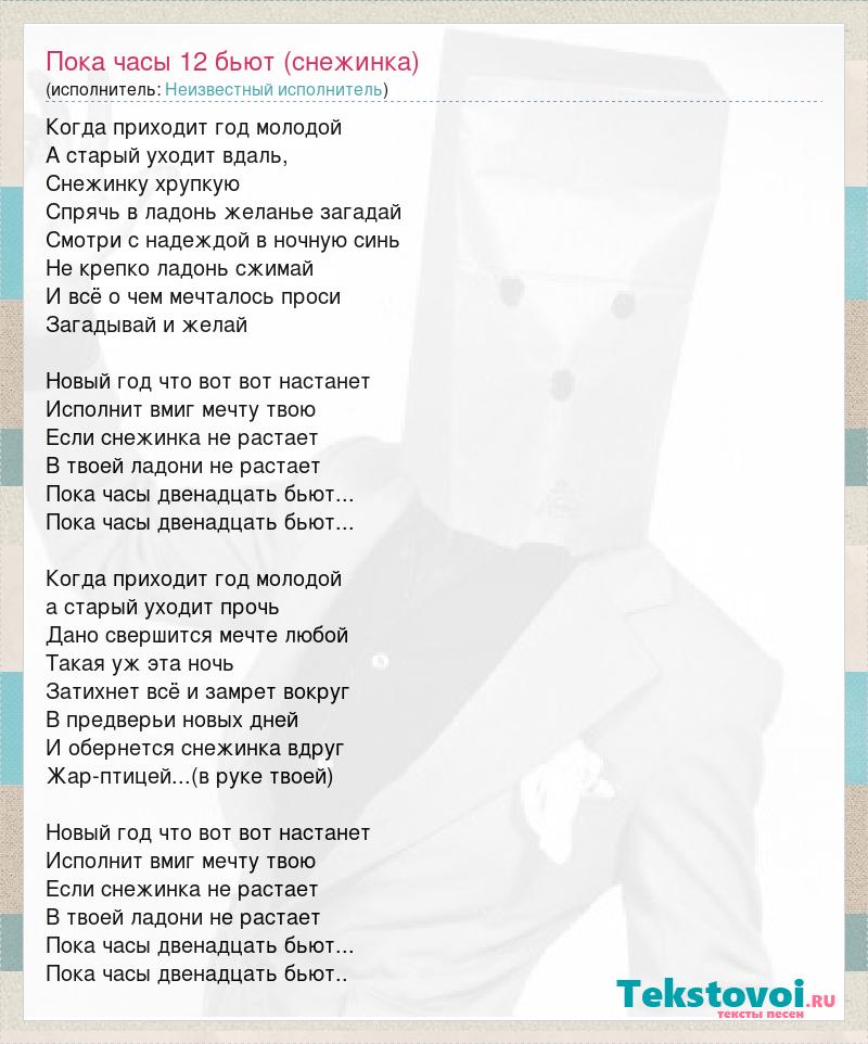 Когда приходит год молодой А старый уходит вдаль, Снежинку хрупкую Спрячь в ладонь желанье загадай Смотри с надеждой в ночную синь Не крепко ладонь сжимай И всё о чем мечталось проси Загадывай и желай Новый год что вот вот настанет Исполнит вмиг мечту твою Если снежинка не растает В твоей ладони не растает Пока часы двенадцать бьют... Пока часы двенадцать бьют... Когда приходит год молодой а старый уходит прочь Дано свершится мечте любой Такая уж эта ночь Затихнет всё и замрет вокруг В предверьи новых дней И обернется снежинка вдруг Жар-птицей...(в руке твоей) Новый год что вот вот настанет Исполнит вмиг мечту твою Если снежинка не растает В твоей ладони не растает Пока часы двенадцать бьют... Пока часы двенадцать бьют..