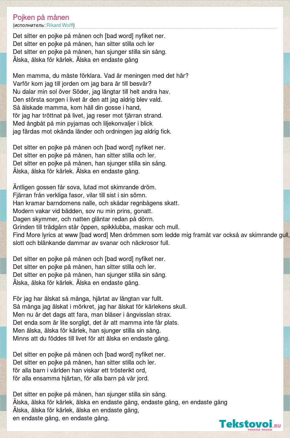 Det sitter en pojke på månen och [bad word] nyfiket ner. Det sitter en pojke på månen, han sitter stilla och ler Det sitter en pojke på månen, han sjunger stilla sin sång. Älska, älska för kärlek. Älska en endaste gång Men mamma, du måste förklara. Vad är meningen med det här? Varför kom jag till jorden om jag bara är till besvär? Nu dalar min sol över Söder, jag längtar till helt andra hav. Den största sorgen i livet är den att jag aldrig blev vald. Så älskade mamma, kom håll din gosse i hand, för jag har tröttnat på livet, jag reser mot fjärran strand. Med ångbåt på min pyjamas och liljekonvaljer i blick jag färdas mot okända länder och ordningen jag aldrig fick. Det sitter en pojke på månen och [bad word] nyfiket ner. Det sitter en pojke på månen, han sitter stilla och ler. Det sitter en pojke på månen, han sjunger stilla sin sång. Älska, älska för kärlek. Älska en endaste gång. Äntligen gossen får sova, lutad mot skimrande dröm. Fjärran från verkliga fasor, vilar till sist i sin sömn. Han kramar barndomens nalle, och skådar regnbågens skatt. Modern vakar vid bädden, sov nu min prins, gonatt. Dagen skymmer, och natten gläntar redan på dörrn. Grinden till trädgårn står öppen, spikklubba, maskar och mull. Find More lyrics at www [bad word] Men drömmen som ledde mig framåt var också av skimrande gull, slott och blänkande dammar av svanar och näckrosor full. Det sitter en pojke på månen och [bad word] nyfiket ner. Det sitter en pojke på månen, han sitter stilla och ler. Det sitter en pojke på månen, han sjunger stilla sin sång. Älska, älska för kärlek. Älska en endaste gång. För jag har älskat så många, hjärtat av längtan var fullt. Så många jag älskat i mörkret, jag har älskat för kärlekens skull. Men nu är det dags att fara, man blåser i ångvisslan strax. Det enda som är lite sorgligt, det är att mamma inte får plats. Men älska, älska för kärlek, han sjunger stilla sin sång. Minns att du föddes till livet för att älska en endaste gång. Det sitter en pojke på månen och [bad word] nyfiket ner. Det sitter en pojke på månen, han sitter stilla och ler. för alla barn i världen han viskar ett trösterikt ord, för alla ensamma hjärtan, för alla barn på vår jord. Det sitter en pojke på månen, han sjunger stilla sin sång. Älska, älska för kärlek, älska en endaste gång, endaste gång, en endaste gång Älska, älska för kärlek, älska en endaste gång, en endaste gång, en endaste gång.