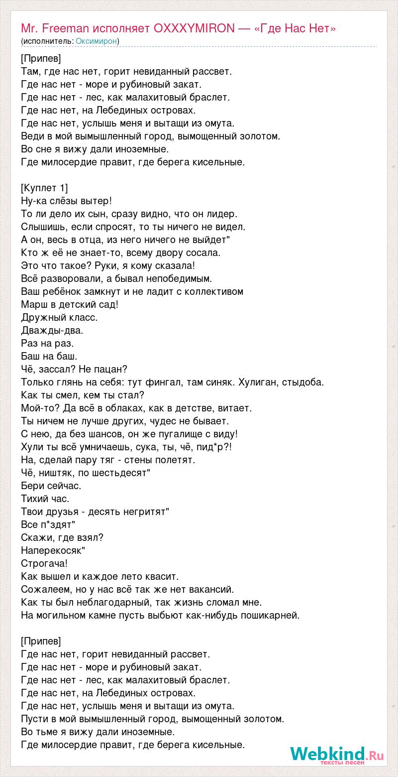 [Припев] Там, где нас нет, горит невиданный рассвет. Где нас нет - море и рубиновый закат. Где нас нет - лес, как малахитовый браслет. Где нас нет, на Лебединых островах. Где нас нет, услышь меня и вытащи из омута. Веди в мой вымышленный город, вымощенный золотом. Во сне я вижу дали иноземные. Где милосердие правит, где берега кисельные. [Куплет 1] Ну-ка слёзы вытер! То ли дело их сын, сразу видно, что он лидер. Слышишь, если спросят, то ты ничего не видел. А он, весь в отца, из него ничего не выйдет" Кто ж её не знает-то, всему двору сосала. Это что такое? Руки, я кому сказала! Всё разворовали, а бывал непобедимым. Ваш ребёнок замкнут и не ладит с коллективом Марш в детский сад! Дружный класс. Дважды-два. Раз на раз. Баш на баш. Чё, зассал? Не пацан? Только глянь на себя: тут фингал, там синяк. Хулиган, стыдоба. Как ты смел, кем ты стал? Мой-то? Да всё в облаках, как в детстве, витает. Ты ничем не лучше других, чудес не бывает. С нею, да без шансов, он же пугалище с виду! Хули ты всё умничаешь, сука, ты, чё, пид*р?! На, сделай пару тяг - стены полетят. Чё, ништяк, по шестьдесят" Бери сейчас. Тихий час. Твои друзья - десять негритят" Все п*здят" Скажи, где взял? Наперекосяк" Строгача! Как вышел и каждое лето квасит. Сожалеем, но у нас всё так же нет вакансий. Как ты был неблагодарный, так жизнь сломал мне. На могильном камне пусть выбьют как-нибудь пошикарней. [Припев] Где нас нет, горит невиданный рассвет. Где нас нет - море и рубиновый закат. Где нас нет - лес, как малахитовый браслет. Где нас нет, на Лебединых островах. Где нас нет, услышь меня и вытащи из омута. Пусти в мой вымышленный город, вымощенный золотом. Во тьме я вижу дали иноземные. Где милосердие правит, где берега кисельные.