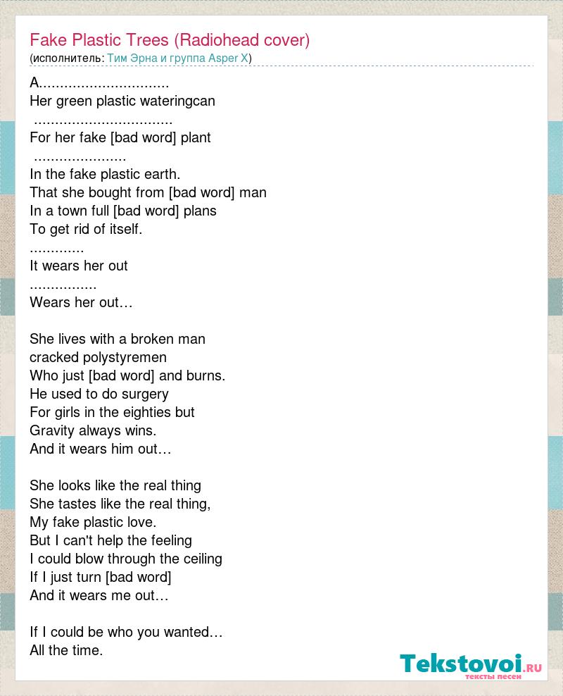 A............................... Her green plastic wateringcan ................................. For her fake [bad word] plant ...................... In the fake plastic earth. That she bought from [bad word] man In a town full [bad word] plans To get rid of itself. ............. It wears her out ................ Wears her out… She lives with a broken man cracked polystyremen Who just [bad word] and burns. He used to do surgery For girls in the eighties but Gravity always wins. And it wears him out… She looks like the real thing She tastes like the real thing, My fake plastic love. But I can't help the feeling I could blow through the ceiling If I just turn [bad word] And it wears me out… If I could be who you wanted… All the time.