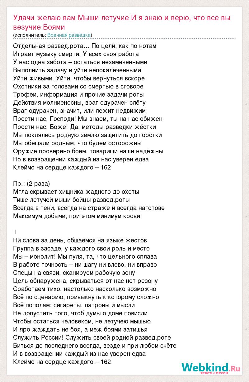 Главная→Исполнители→Военная разведка→Удачи желаю вам Мыши летучие И я знаю и верю, что все вы везучие Боями