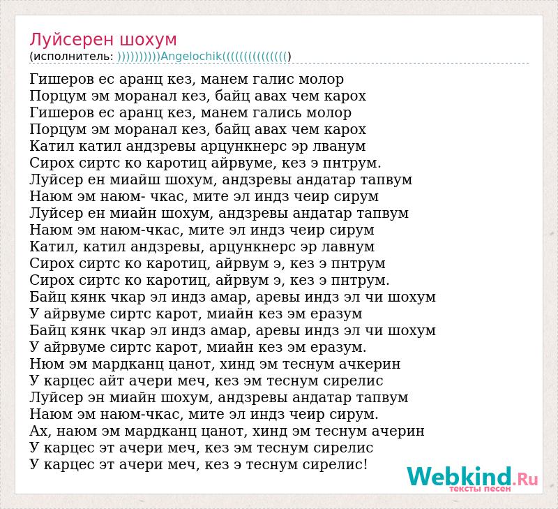 Гишеров ес аранц кез, манем галис молор Порцум эм моранал кез, байц авах чем карох Гишеров ес аранц кез, манем гались молор Порцум эм моранал кез, байц авах чем карох Катил катил андзревы арцункнерс эр лванум Сирох сиртс ко каротиц айрвуме, кез э пнтрум. Луйсер ен миайш шохум, андзревы андатар тапвум Наюм эм наюм- чкас, мите эл индз чеир сирум Луйсер ен миайн шохум, андзревы андатар тапвум Наюм эм наюм-чкас, мите эл индз чеир сирум Катил, катил андзревы, арцункнерс эр лавнум Сирох сиртс ко каротиц, айрвум э, кез э пнтрум Сирох сиртс ко каротиц, айрвум э, кез э пнтрум. Байц кянк чкар эл индз амар, аревы индз эл чи шохум У айрвуме сиртс карот, миайн кез эм еразум Байц кянк чкар эл индз амар, аревы индз эл чи шохум У айрвуме сиртс карот, миайн кез эм еразум. Нюм эм мардканц цанот, хинд эм теснум ачкерин У карцес айт ачери меч, кез эм теснум сирелис Луйсер эн миайн шохум, андзревы андатар тапвум Наюм эм наюм-чкас, мите эл индз чеир сирум. Ах, наюм эм мардканц цанот, хинд эм теснум ачерин У карцес эт ачери меч, кез эм теснум сирелис У карцес эт ачери меч, кез э теснум сирелис!