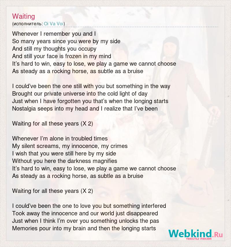 Whenever I remember you and I So many years since you were by my side And still my thoughts you occupy And still your face is frozen in my mind It’s hard to win, easy to lose, we play a game we cannot choose As steady as a rocking horse, as subtle as a bruise I could’ve been the one still with you but something in the way Brought our private universe into the cold light of day Just when I have forgotten you that’s when the longing starts Nostalgia seeps into my head and I realize that I’ve been Waiting for all these years (X 2) Whenever I’m alone in troubled times My silent screams, my innocence, my crimes I wish that you were still here by my side Without you here the darkness magnifies It’s hard to win, easy to lose, we play a game we cannot choose As steady as a rocking horse, as subtle as a bruise Waiting for all these years (X 2) I could’ve been the one to love you but something interfered Took away the innocence and our world just disappeared Just when I think I’m over you something unlocks the pas Memories pour into my brain and then the longing starts