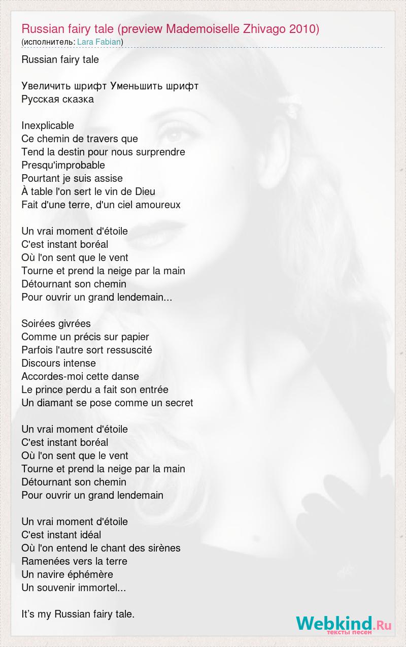 Russian fairy tale Увеличить шрифт Уменьшить шрифт Русская сказка Inexplicable Ce chemin de travers que Tend la destin pour nous surprendre Presqu'improbable Pourtant je suis assise À table l'on sert le vin de Dieu Fait d'une terre, d'un ciel amoureux Un vrai moment d'étoile C'est instant boréal Où l'on sent que le vent Tourne et prend la neige par la main Détournant son chemin Pour ouvrir un grand lendemain... Soirées givrées Comme un précis sur papier Parfois l'autre sort ressuscité Discours intense Accordes-moi cette danse Le prince perdu a fait son entrée Un diamant se pose comme un secret Un vrai moment d'étoile C'est instant boréal Où l'on sent que le vent Tourne et prend la neige par la main Détournant son chemin Pour ouvrir un grand lendemain Un vrai moment d'étoile C'est instant idéal Où l'on entend le chant des sirènes Ramenées vers la terre Un navire éphémère Un souvenir immortel... It’s my Russian fairy tale.
