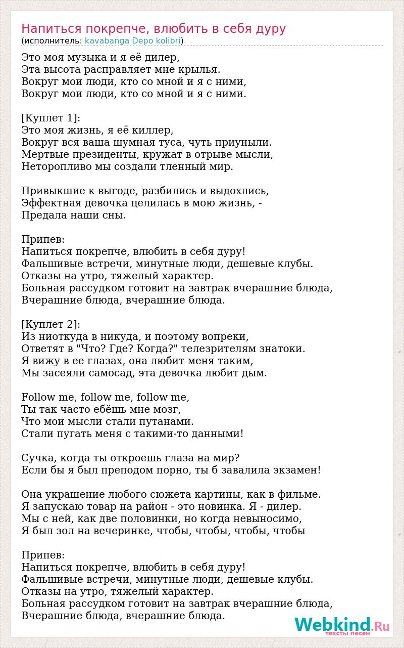Это моя музыка и я её дилер, Эта высота расправляет мне крылья. Вокруг мои люди, кто со мной и я с ними, Вокруг мои люди, кто со мной и я с ними. [Куплет 1]: Это моя жизнь, я её киллер, Вокруг вся ваша шумная туса, чуть приуныли. Мертвые президенты, кружат в отрыве мысли, Неторопливо мы создали тленный мир. Привыкшие к выгоде, разбились и выдохлись, Эффектная девочка целилась в мою жизнь, - Предала наши сны. Припев: Напиться покрепче, влюбить в себя дуру! Фальшивые встречи, минутные люди, дешевые клубы. Отказы на утро, тяжелый характер. Больная рассудком готовит на завтрак вчерашние блюда, Вчерашние блюда, вчерашние блюда. [Куплет 2]: Из ниоткуда в никуда, и поэтому вопреки, Ответят в "Что? Где? Когда?" телезрителям знатоки. Я вижу в ее глазах, она любит меня таким, Мы засеяли самосад, эта девочка любит дым. Follow me, follow me, follow me, Ты так часто ебёшь мне мозг, Что мои мысли стали путанами. Стали пугать меня с такими-то данными! Сучка, когда ты откроешь глаза на мир? Если бы я был преподом порно, ты б завалила экзамен! Она украшение любого сюжета картины, как в фильме. Я запускаю товар на район - это новинка. Я - дилер. Мы с ней, как две половинки, но когда невыносимо, Я был зол на вечеринке, чтобы, чтобы, чтобы, чтобы Припев: Напиться покрепче, влюбить в себя дуру! Фальшивые встречи, минутные люди, дешевые клубы. Отказы на утро, тяжелый характер. Больная рассудком готовит на завтрак вчерашние блюда, Вчерашние блюда, вчерашние блюда.