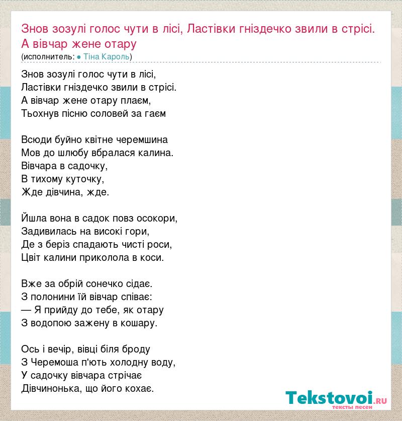 Главная→Исполнители→● Тіна Кароль→Знов зозулі голос чути в лісі, Ластівки гніздечко звили в стрісі. А вів