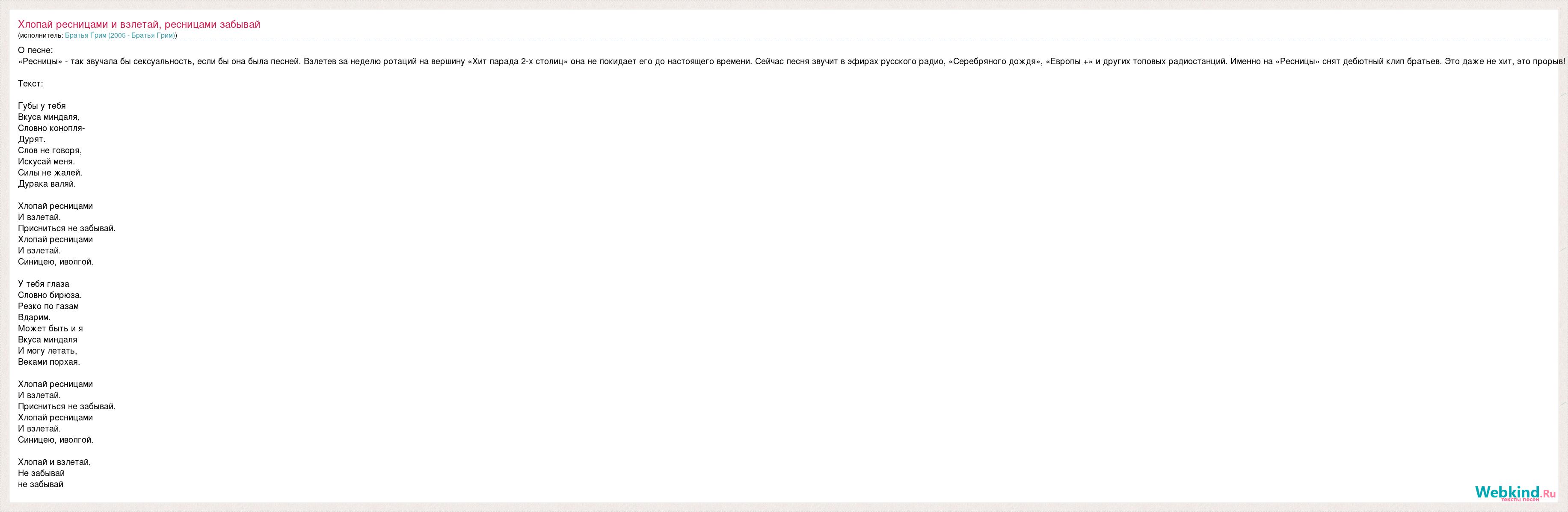 О песне: «Ресницы» - так звучала бы сексуальность, если бы она была песней. Взлетев за неделю ротаций на вершину «Хит парада 2-х столиц» она не покидает его до настоящего времени. Сейчас песня звучит в эфирах русского радио, «Серебряного дождя», «Европы +» и других топовых радиостанций. Именно на «Ресницы» снят дебютный клип братьев. Это даже не хит, это прорыв! Текст: Губы у тебя Вкуса миндаля, Словно конопля- Дурят. Слов не говоря, Искусай меня. Силы не жалей. Дурака валяй. Хлопай ресницами И взлетай. Присниться не забывай. Хлопай ресницами И взлетай. Синицею, иволгой. У тебя глаза Словно бирюза. Резко по газам Вдарим. Может быть и я Вкуса миндаля И могу летать, Веками порхая. Хлопай ресницами И взлетай. Присниться не забывай. Хлопай ресницами И взлетай. Синицею, иволгой. Хлопай и взлетай, Не забывай не забывай