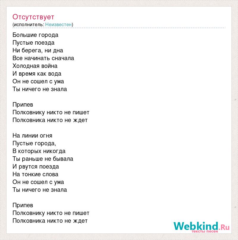 Большие города Пустые поезда Ни берега, ни дна Все начинать сначала Холодная война И время как вода Он не сошел с ума Ты ничего не знала Припев Полковнику никто не пишет Полковника никто не ждет На линии огня Пустые города, В которых никогда Ты раньше не бывала И рвутся поезда На тонкие слова Он не сошел с ума Ты ничего не знала Припев Полковнику никто не пишет Полковника никто не ждет