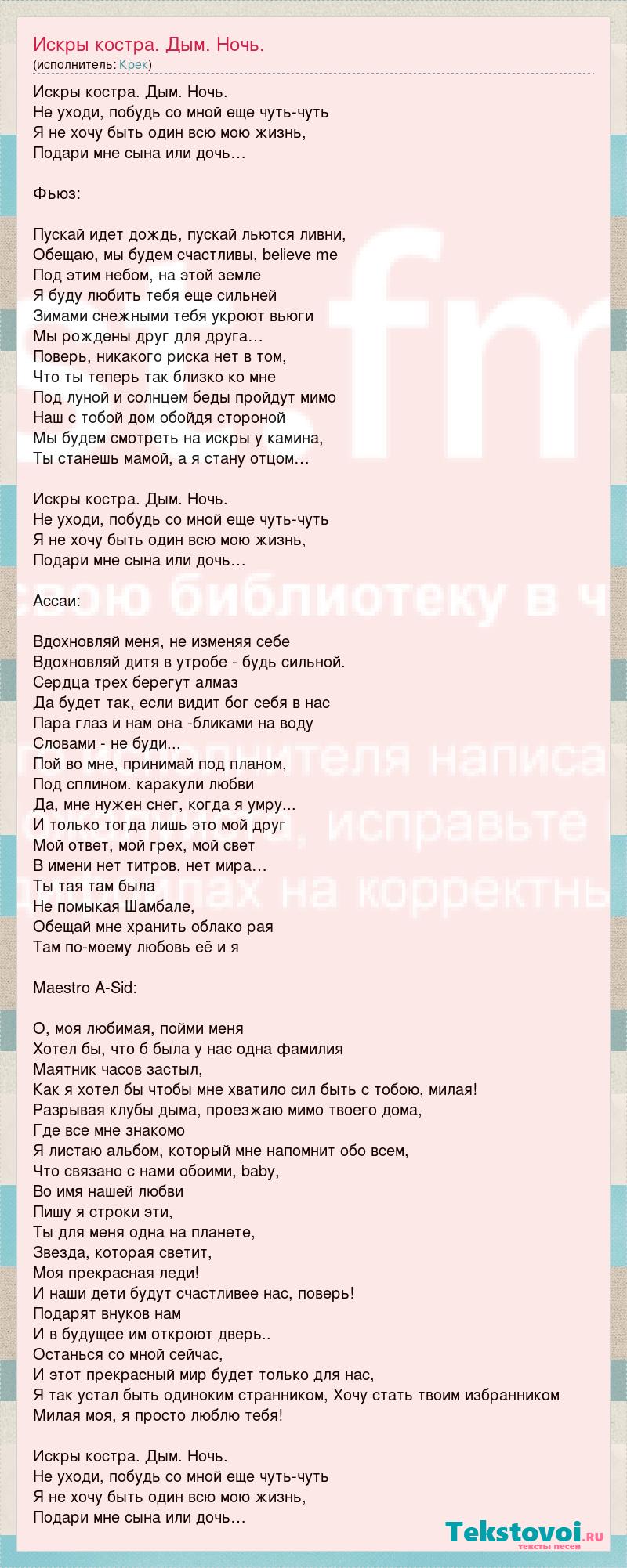 Искры костра. Дым. Ночь. Не уходи, побудь со мной еще чуть-чуть Я не хочу быть один всю мою жизнь, Подари мне сына или дочь… Фьюз: Пускай идет дождь, пускай льются ливни, Обещаю, мы будем счастливы, believe me Под этим небом, на этой земле Я буду любить тебя еще сильней Зимами снежными тебя укроют вьюги Мы рождены друг для друга… Поверь, никакого риска нет в том, Что ты теперь так близко ко мне Под луной и солнцем беды пройдут мимо Наш с тобой дом обойдя стороной Мы будем смотреть на искры у камина, Ты станешь мамой, а я стану отцом… Искры костра. Дым. Ночь. Не уходи, побудь со мной еще чуть-чуть Я не хочу быть один всю мою жизнь, Подари мне сына или дочь… Ассаи: Вдохновляй меня, не изменяя себе Вдохновляй дитя в утробе - будь сильной. Сердца трех берегут алмаз Да будет так, если видит бог себя в нас Пара глаз и нам она -бликами на воду Словами - не буди... Пой во мне, принимай под планом, Под сплином. каракули любви Да, мне нужен снег, когда я умру... И только тогда лишь это мой друг Мой ответ, мой грех, мой свет В имени нет титров, нет мира… Ты тая там была Не помыкая Шамбале, Обещай мне хранить облако рая Там по-моему любовь её и я Maestro A-Sid: О, моя любимая, пойми меня Хотел бы, что б была у нас одна фамилия Маятник часов застыл, Как я хотел бы чтобы мне хватило сил быть с тобою, милая! Разрывая клубы дыма, проезжаю мимо твоего дома, Где все мне знакомо Я листаю альбом, который мне напомнит обо всем, Что связано с нами обоими, baby, Во имя нашей любви Пишу я строки эти, Ты для меня одна на планете, Звезда, которая светит, Моя прекрасная леди! И наши дети будут счастливее нас, поверь! Подарят внуков нам И в будущее им откроют дверь.. Останься со мной сейчас, И этот прекрасный мир будет только для нас, Я так устал быть одиноким странником, Хочу стать твоим избранником Милая моя, я просто люблю тебя! Искры костра. Дым. Ночь. Не уходи, побудь со мной еще чуть-чуть Я не хочу быть один всю мою жизнь, Подари мне сына или дочь…