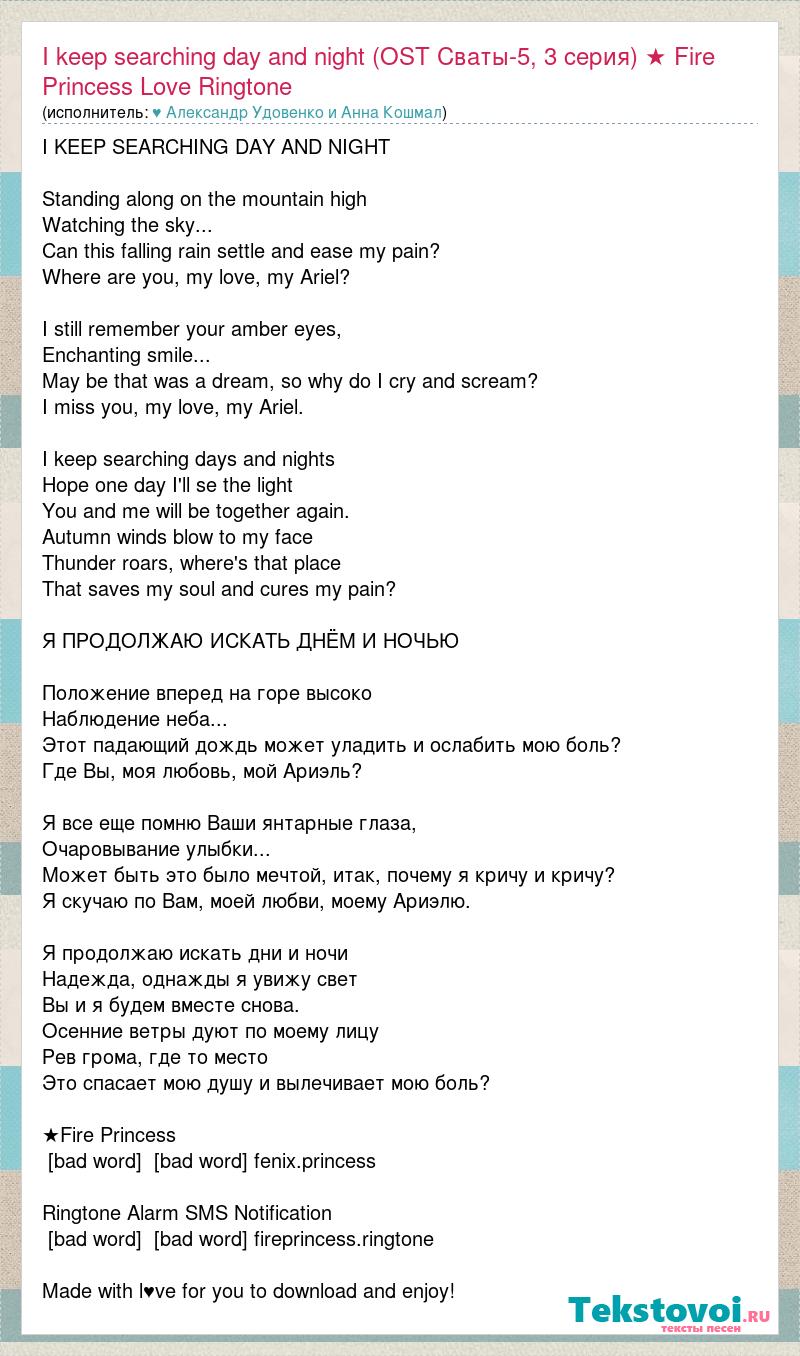 I KEEP SEARCHING DAY AND NIGHT Standing along on the mountain high Watching the sky... Can this falling rain settle and ease my pain? Where are you, my love, my Ariel? I still remember your amber eyes, Enchanting smile... May be that was a dream, so why do I cry and scream? I miss you, my love, my Ariel. I keep searching days and nights Hope one day I'll se the light You and me will be together again. Autumn winds blow to my face Thunder roars, where's that place That saves my soul and cures my pain? Я ПРОДОЛЖАЮ ИСКАТЬ ДНЁМ И НОЧЬЮ Положение вперед на горе высоко Наблюдение неба... Этот падающий дождь может уладить и ослабить мою боль? Где Вы, моя любовь, мой Ариэль? Я все еще помню Ваши янтарные глаза, Очаровывание улыбки... Может быть это было мечтой, итак, почему я кричу и кричу? Я скучаю по Вам, моей любви, моему Ариэлю. Я продолжаю искать дни и ночи Надежда, однажды я увижу свет Вы и я будем вместе снова. Осенние ветры дуют по моему лицу Рев грома, где то место Это спасает мою душу и вылечивает мою боль? ★Fire Princess [bad word] [bad word] fenix.princess Ringtone Alarm SMS Notification [bad word] [bad word] fireprincess.ringtone Made with l♥ve for you to download and enjoy!