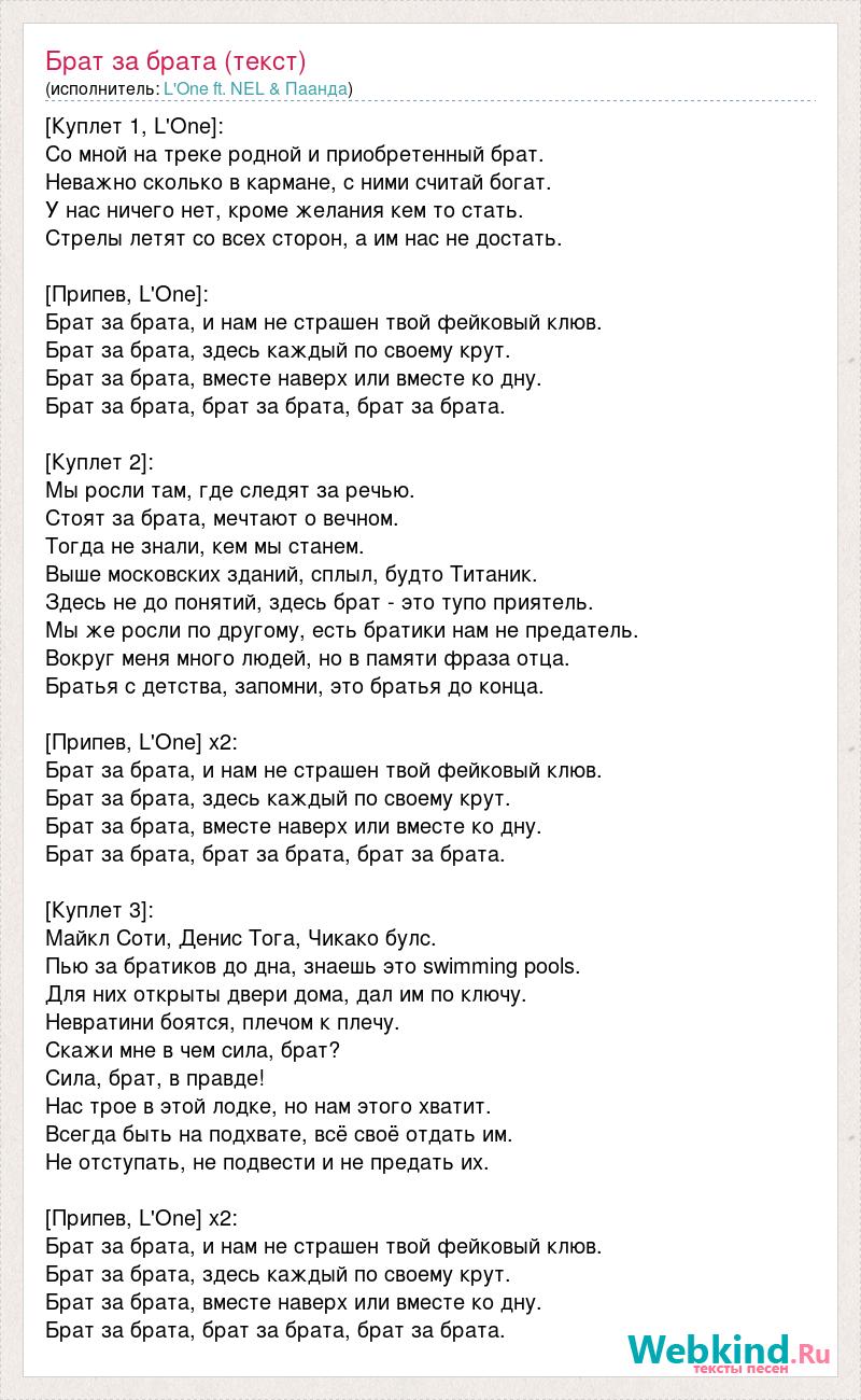 [Куплет 1, L'One]: Со мной на треке родной и приобретенный брат. Неважно сколько в кармане, с ними считай богат. У нас ничего нет, кроме желания кем то стать. Стрелы летят со всех сторон, а им нас не достать. [Припев, L'One]: Брат за брата, и нам не страшен твой фейковый клюв. Брат за брата, здесь каждый по своему крут. Брат за брата, вместе наверх или вместе ко дну. Брат за брата, брат за брата, брат за брата. [Куплет 2]: Мы росли там, где следят за речью. Стоят за брата, мечтают о вечном. Тогда не знали, кем мы станем. Выше московских зданий, сплыл, будто Титаник. Здесь не до понятий, здесь брат - это тупо приятель. Мы же росли по другому, есть братики нам не предатель. Вокруг меня много людей, но в памяти фраза отца. Братья с детства, запомни, это братья до конца. [Припев, L'One] x2: Брат за брата, и нам не страшен твой фейковый клюв. Брат за брата, здесь каждый по своему крут. Брат за брата, вместе наверх или вместе ко дну. Брат за брата, брат за брата, брат за брата. [Куплет 3]: Майкл Соти, Денис Тога, Чикако булс. Пью за братиков до дна, знаешь это swimming pools. Для них открыты двери дома, дал им по ключу. Невратини боятся, плечом к плечу. Скажи мне в чем сила, брат? Сила, брат, в правде! Нас трое в этой лодке, но нам этого хватит. Всегда быть на подхвате, всё своё отдать им. Не отступать, не подвести и не предать их. [Припев, L'One] x2: Брат за брата, и нам не страшен твой фейковый клюв. Брат за брата, здесь каждый по своему крут. Брат за брата, вместе наверх или вместе ко дну. Брат за брата, брат за брата, брат за брата.