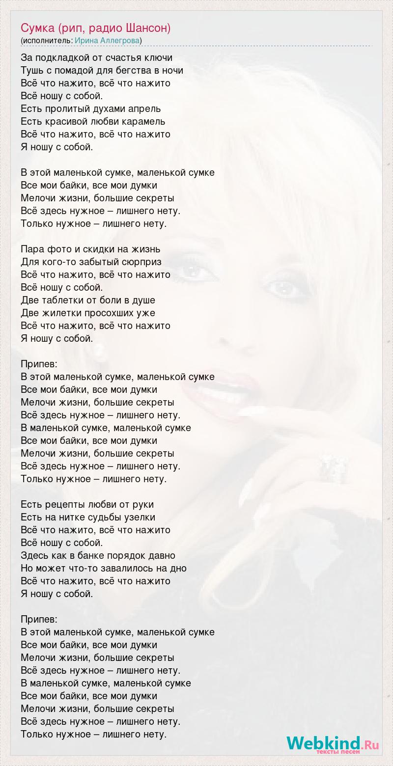 За подкладкой от счастья ключи Тушь с помадой для бегства в ночи Всё что нажито, всё что нажито Всё ношу с собой. Есть пролитый духами апрель Есть красивой любви карамель Всё что нажито, всё что нажито Я ношу с собой. В этой маленькой сумке, маленькой сумке Все мои байки, все мои думки Мелочи жизни, большие секреты Всё здесь нужное – лишнего нету. Только нужное – лишнего нету. Пара фото и скидки на жизнь Для кого-то забытый сюрприз Всё что нажито, всё что нажито Всё ношу с собой. Две таблетки от боли в душе Две жилетки просохших уже Всё что нажито, всё что нажито Я ношу с собой. Припев: В этой маленькой сумке, маленькой сумке Все мои байки, все мои думки Мелочи жизни, большие секреты Всё здесь нужное – лишнего нету. В маленькой сумке, маленькой сумке Все мои байки, все мои думки Мелочи жизни, большие секреты Всё здесь нужное – лишнего нету. Только нужное – лишнего нету. Есть рецепты любви от руки Есть на нитке судьбы узелки Всё что нажито, всё что нажито Всё ношу с собой. Здесь как в банке порядок давно Но может что-то завалилось на дно Всё что нажито, всё что нажито Я ношу с собой. Припев: В этой маленькой сумке, маленькой сумке Все мои байки, все мои думки Мелочи жизни, большие секреты Всё здесь нужное – лишнего нету. В маленькой сумке, маленькой сумке Все мои байки, все мои думки Мелочи жизни, большие секреты Всё здесь нужное – лишнего нету. Только нужное – лишнего нету.