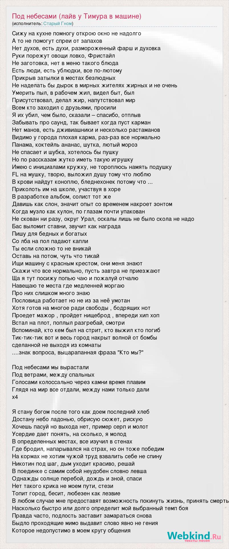 Сижу на кухне помногу открою окно не надолго А то не помогут спреи от запахов Нет духов, есть духи, размороженный фарш и духовка Руки порежут овощи ловко, Фристайл Не заготовка, нет в меню такого блюда Есть люди, есть ублюдки, все по-лютому Прикрыв затылки в местах безлюдных Не наделать бы дырок в мирных жителях жирных и не очень Умерить пыл, в рабочем жил, видел быт, был Присутствовал, делал жир, напутствовал мир Всем кто заходил с друзьями, просили Я их убил, чем было, сказали – спасибо, отплыв Забывать про саунд, так бывает когда пуст карман Нет манов, есть дживиашники и несколько растаманов Видимо у города плохая карма, раз-раз все нормально Панама, коктейль ананас, шутка, лютый мороз Не спасает и шубка, хотелось бы пушку Но по рассказам жутко иметь такую игрушку Имею с инициалами кружку, не тороплюсь намять подушку FL на мушку, творю, выложил душу тому что люблю В крови найдут коноплю, бледнехонек потому что ... Приколоть им на школе, участвуя в хоре В разработке альбом, солист тот же Давишь как слон, значит опыт со временем накроет зонтом Когда музло как кулон, по глазам почти упакован Не скован ни разу, округ Урал, оскалы лишь не было скола не надо Бас выломит ставни, звучит как награда Пишу для бедных и богатых Со лба на пол падают капли Ты если сложно то не вникай Оставь на потом, чуть что тикай Ищи машину с красным крестом, они меня знают Скажи что все нормально, пусть завтра не приезжают Ща я тут посижу попью чаю и пожалуй отчалю Навещаю те места где медленней моргаю Про них слишком много знаю Пословица работает но не из за неё умотан Хотя готов на многое ради свободы , бодрящих нот Проедет мажор , пройдет нищеброд , впереди хип хоп Встал на плот, поплыл разгребай, смотри Вспоминай, кто кем был на стрит, кто выжил кто погиб Тик-тик-тик вот и весь город накрыт волной от бомбы сделанной не выходя из комнаты ....знак вопроса, выцарапанная фраза "Кто мы?" Под небесами мы вырастали Под ветрами, между спальных Голосами колоссально через камни время плавим Глядя на мир все отдали, между нами только дали x4 Я стану богом после того как доем последний хлеб Достану небо ладонью, обрисую сюжет, рискую Хочешь пасуй но выхода нет, пример серп и молот Усердие дает понять, на сколько, я молод В определенных местах, все изучил в стенах Где бродил, напарывался на страх, но он тоже победим На кормах не хотим чужой труд взвалить себе не спину Никотин под шаг, дым уходит красиво, решай В поединке с самим собой неудобен словно левша Однажды солнце перебой, дождь и зной, спаси Нет такого крика не моем пути, стези Топит город, бесит, любезен как лезвие В любом случае мне предоставят возможность покинуть жизнь, принять смерть Насколько быстро или долго определит мой выбранный темп боя Правда часто, подлость заставит замараться снова Быдло проходящие мимо выдавит слово явно не гения Которое недопустимо в моем кругу общения