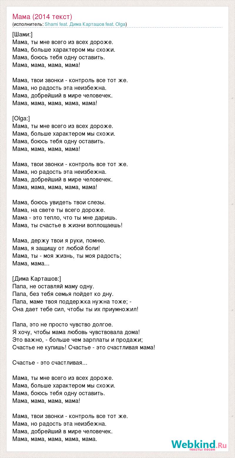 [Шами:] Мама, ты мне всего из всех дороже. Мама, больше характером мы схожи. Мама, боюсь тебя одну оставить. Мама, мама, мама, мама! Мама, твои звонки - контроль все тот же. Мама, но радость эта неизбежна. Мама, добрейший в мире человечек. Мама, мама, мама, мама, мама! [Olga:] Мама, ты мне всего из всех дороже. Мама, больше характером мы схожи. Мама, боюсь тебя одну оставить. Мама, мама, мама, мама! Мама, твои звонки - контроль все тот же. Мама, но радость эта неизбежна. Мама, добрейший в мире человечек. Мама, мама, мама, мама, мама! Мама, боюсь увидеть твои слезы. Мама, на свете ты всего дороже. Мама - это тепло, что ты мне даришь. Мама, ты счастье в жизни воплощаешь! Мама, держу твои я руки, помню. Мама, я защищу от любой боли! Мама, ты - моя жизнь, ты моя радость; Мама, мама... [Дима Карташов:] Папа, не оставляй маму одну. Папа, без тебя семья пойдет ко дну. Папа, маме твоя поддержка нужна тоже; - Она дает тебе сил, чтобы ты их приумножил! Папа, это не просто чувство долгое. Я хочу, чтобы мама любовь чувствовала дома! Это важно, - больше чем зарплаты и продажи; Счастье не купишь! Счастье - это счастливая мама! Счастье - это счастливая... Мама, ты мне всего из всех дороже. Мама, больше характером мы схожи. Мама, боюсь тебя одну оставить. Мама, мама, мама, мама! Мама, твои звонки - контроль все тот же. Мама, но радость эта неизбежна. Мама, добрейший в мире человечек. Мама, мама, мама, мама, мама.