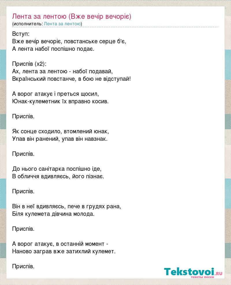 Вступ: Вже вечір вечоріє, повстанське серце б'є, А лента набої поспішно подає. Приспів (x2): Ах, лента за лентою - набої подавай, Вкраїнський повстанче, в бою не відступай! А ворог атакує і преться щосил, Юнак-кулеметник їх вправно косив. Приспів. Як сонце сходило, втомлений юнак, Упав він ранений, упав він навзнак. Приспів. До нього санітарка поспішно іде, В обличчя вдивляєсь, його пізнає. Приспів. Він в неї вдивляєсь, пече в грудях рана, Біля кулемета дівчина молода. Приспів. А ворог атакує, в останній момент - Наново заграв вже затихлий кулемет. Приспів.